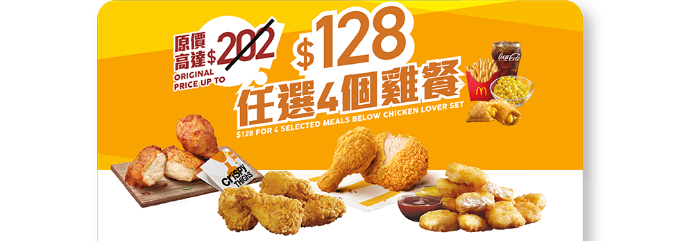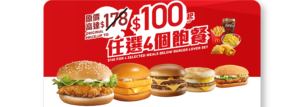 早上11時後則有3款有三款套票選擇,包括「飽你鍾意套餐」低至$100可選購板燒雞腿飽、脆辣雞腿飽或豬柳蛋漢堡套餐,或加$6升級至雙層魚柳飽及雙層芝士孖堡套餐;「雞會難得套餐」套票優惠以$128嘆盡4個雞餐,包括脆香雞翼(4件)、原味麥炸雞(2件)、蜜糖BBQ麥炸雞(2件)和麥樂雞 (9件) 套餐。