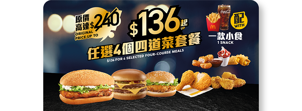 另外,「四重滋味套餐」亦再次登場,僅需$136起就能嘆盡4個套餐配一款指定小食,當中可任選多款人氣超值套餐,包括板燒雞腿飽、豬柳蛋漢堡套餐等,另可加$6可升級至雙層魚柳飽和雙層芝士孖堡,或加$7選擇脆香雞翼(4件)、原味麥炸雞、蜜糖BBQ麥炸雞等套餐,而小食則可選麥樂雞(4件)、蘋果批和朱古力或士多啤梨新地。