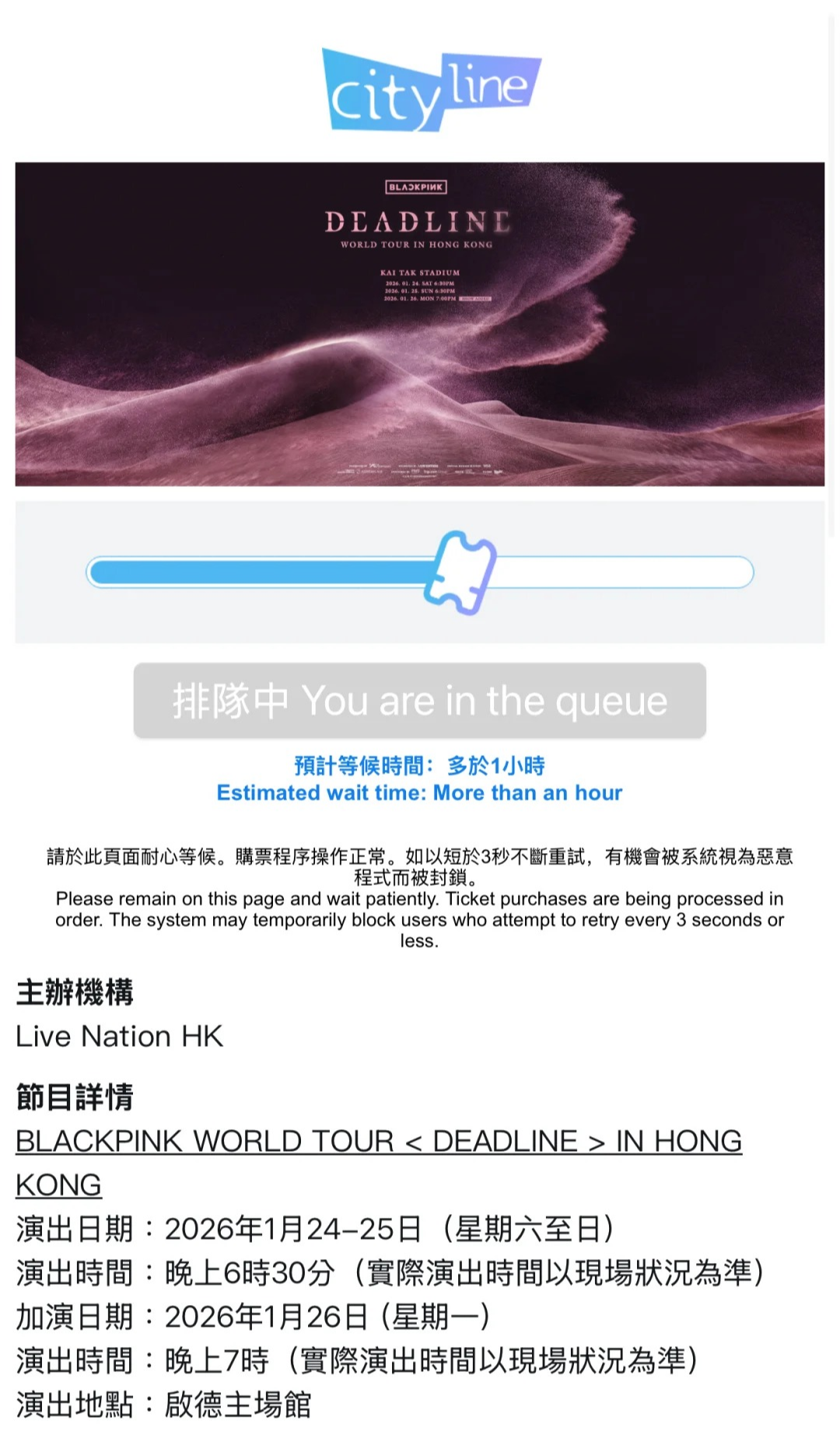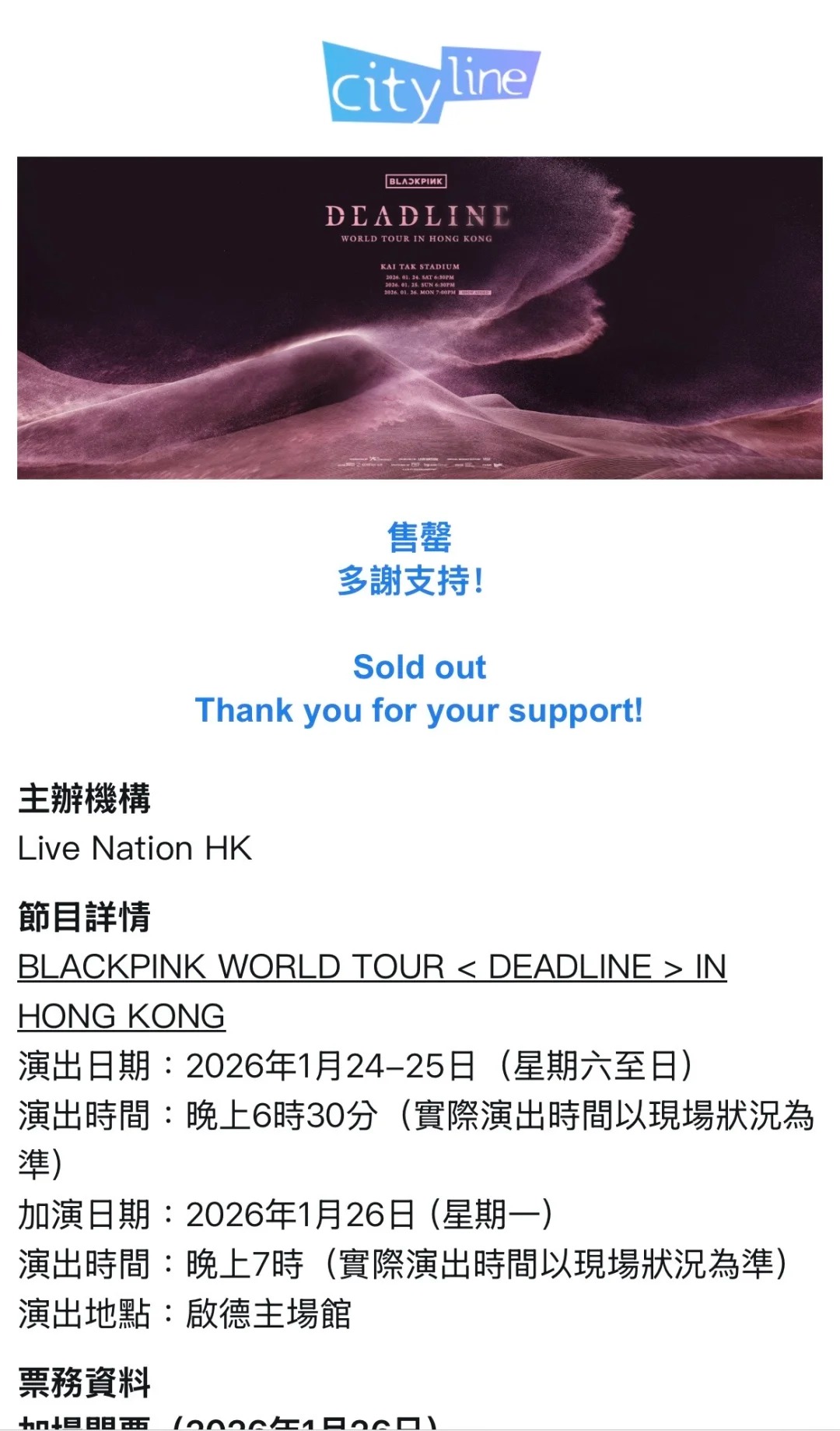 【點新聞報道】BLACKPINK香港站演唱會將於1月24日至26日在啟德開唱,當中1月24、25日兩場已經在6月完售,一票難求,而最新加場1月26日場次今日(10日)中午12時在Cityline正式公售,反應極為熱烈,開售2小時內即秒光。