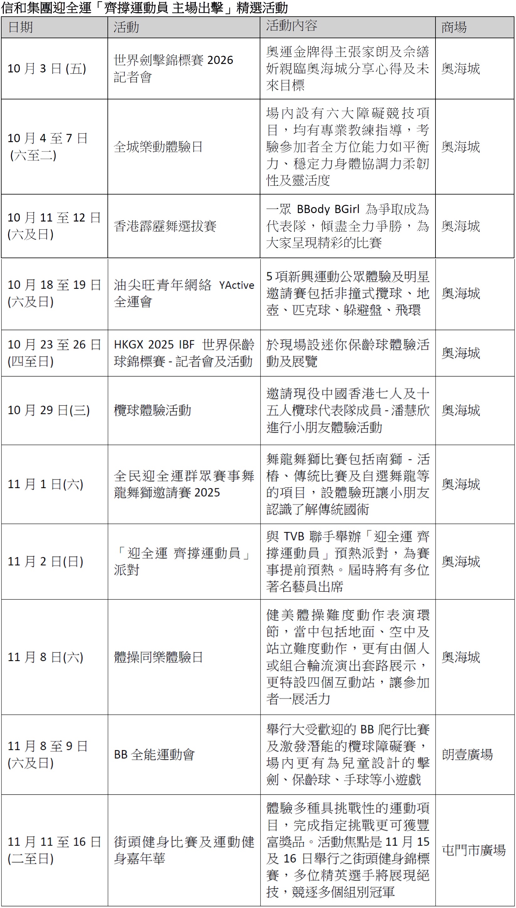 信和集團「齊撐運動員 主場出擊」舉辦逾30項體育活動 4大商場巨型大電視直播賽事