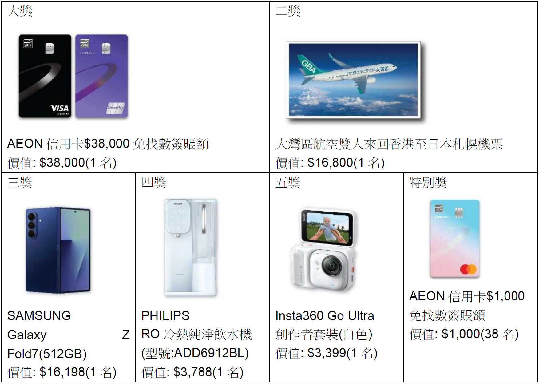 由10月10日至11月5日,於全線AEON或AEON網上購物城購物每滿$200或以上,即有機會贏取AEON信用卡$38,000免找數簽賬額及其他豐富獎品,獎品如下:
