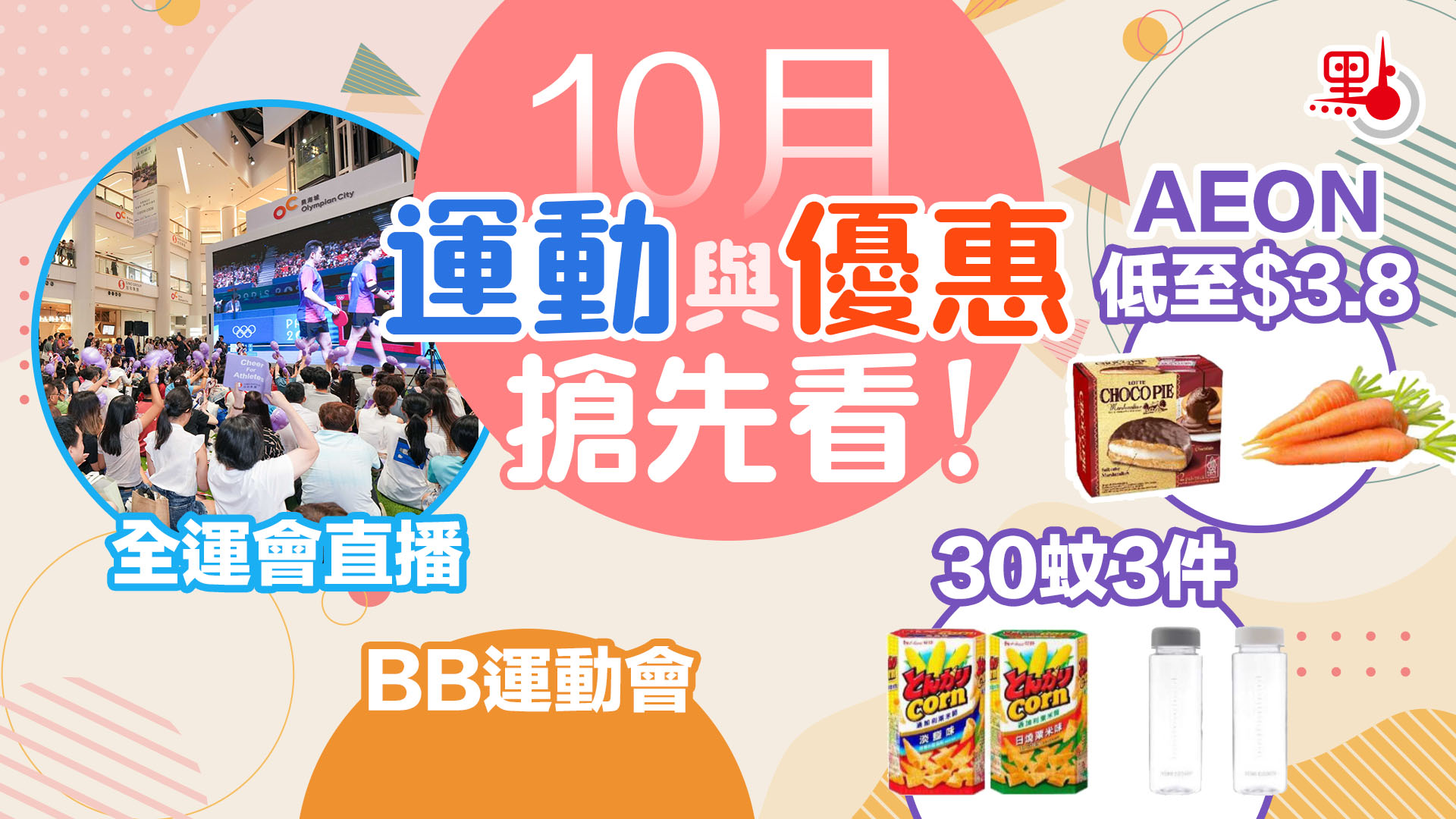 【點新聞報道】全運會倒數一個月,全港都洋溢着火熱的運動氛圍!今個10月,點新聞為大家整理多項運動主題的相關活動,從啟德「毛孩三項鐵寵運動會」、樂富9大爆汗刺激體驗區與訓練營,到奧海城化身運動場館直播全運會賽事、屯門市廣場推出全新戶外匹克球場並舉辦運動健身嘉年華,再到D·PARK「華懋荃運會」的足球賽、行山與曲棍球運動,提前為全運會的到來預熱!運動必不可少,購物優惠當然也不容錯過!莎莎大折日激減22折,逾百款護膚彩妝一口價拿下;AEON推出38周年優惠,全場貨品低至$3.8、均一價$30/3件精選商品,多款優惠率先睇!