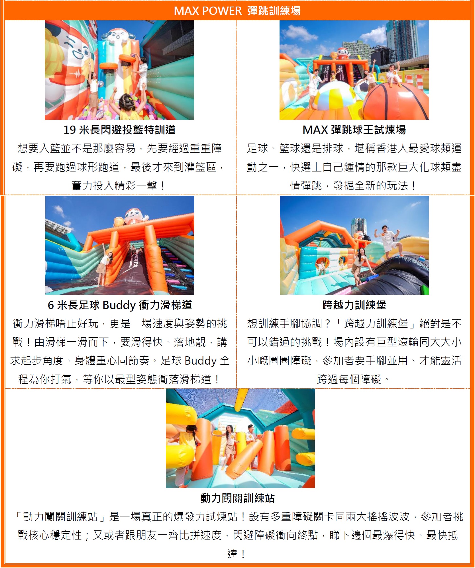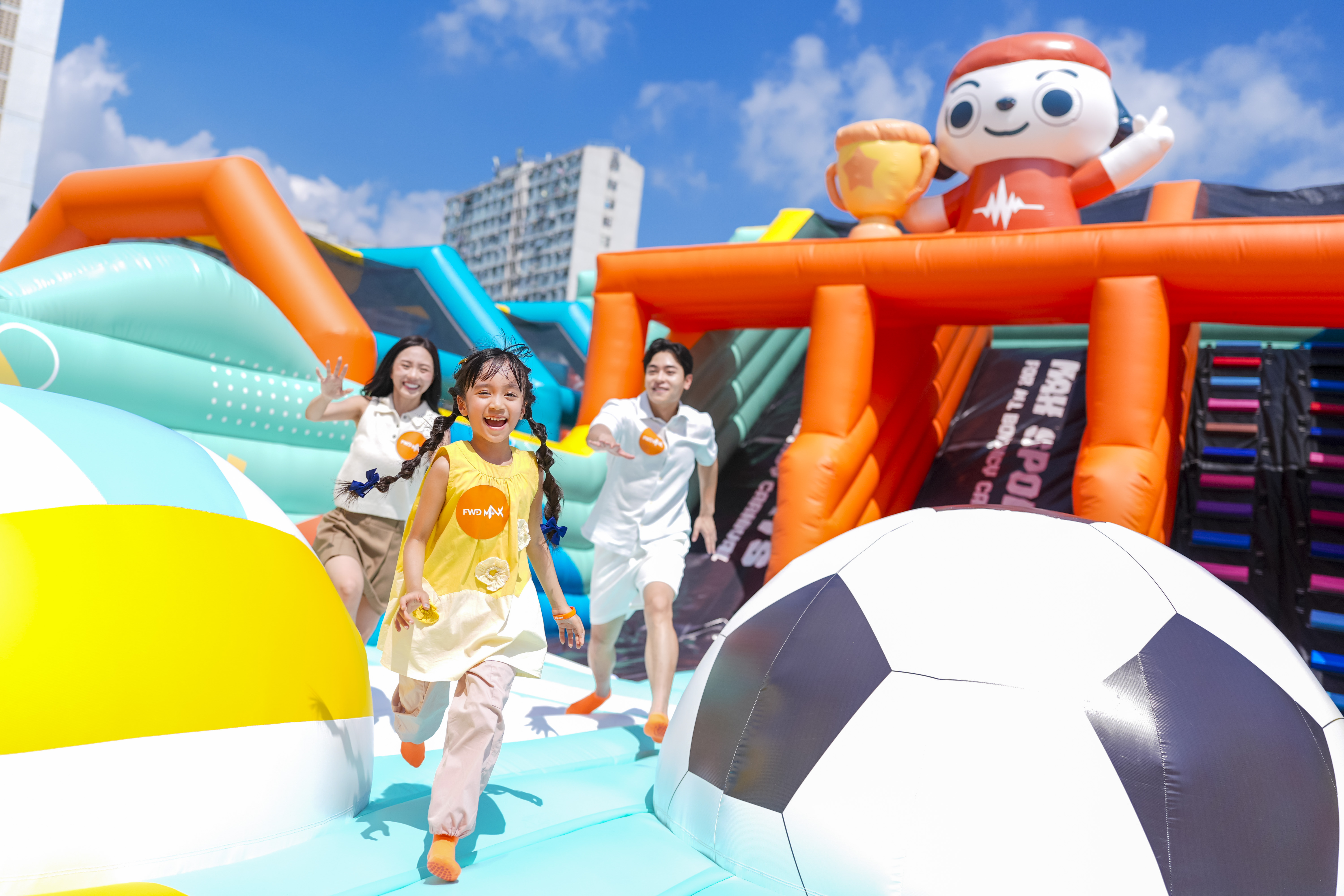 為配合運動熱潮,FWD MAX生活體驗平台首個免費入場「MAX 全民運動嘉年華」,將由10月12日至11月14日於樂富廣場舉行,帶來9大爆汗刺激體驗區任玩放電:逾3,000呎擁有5大運動區的MAX POWER彈跳訓練場,當中必玩6米長足球Buddy衝力滑梯道,及挑戰度滿Fun的19米長閃避投籃特訓道;更有4大動能挑戰營,集趣味、體能與技能訓練於一身,寓教於樂,助小朋友培養運動興趣與潛能!凡FWD MAX會員憑網上登記即可免費參加盡情暢玩,絕對是親子放電、開心爆汗的最佳熱點!