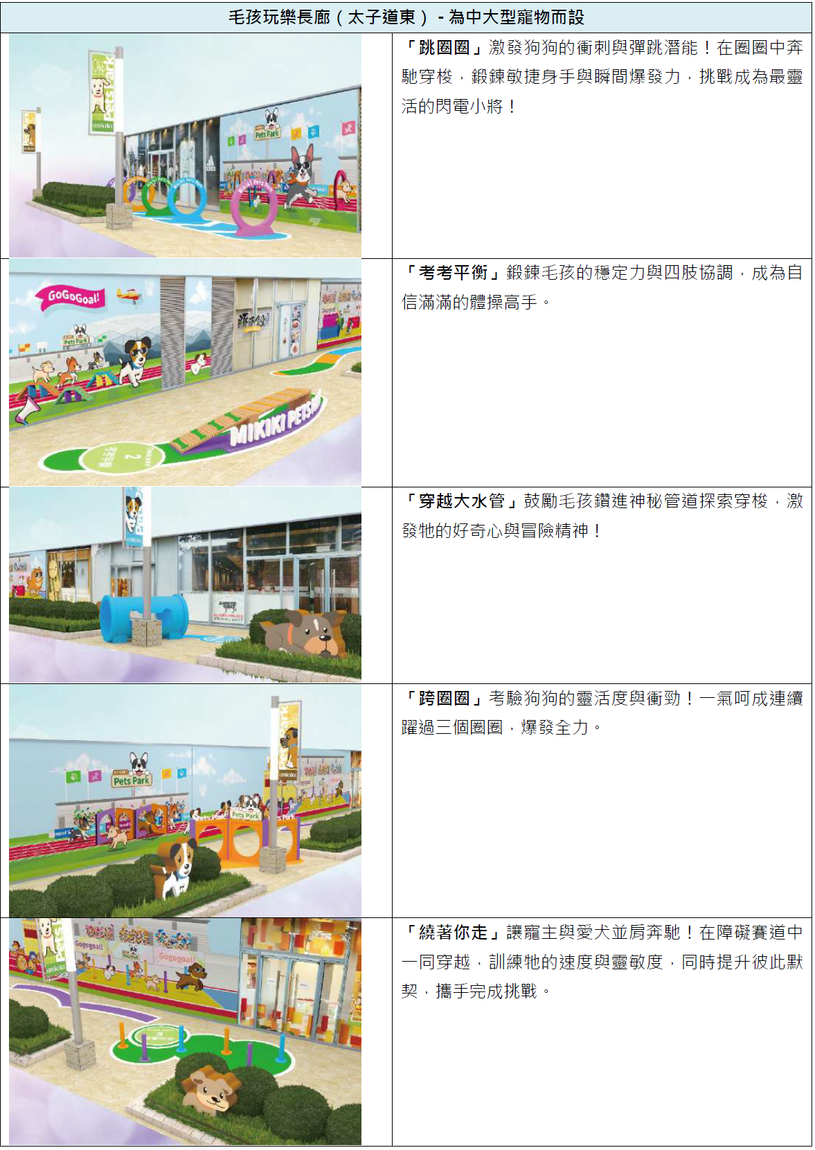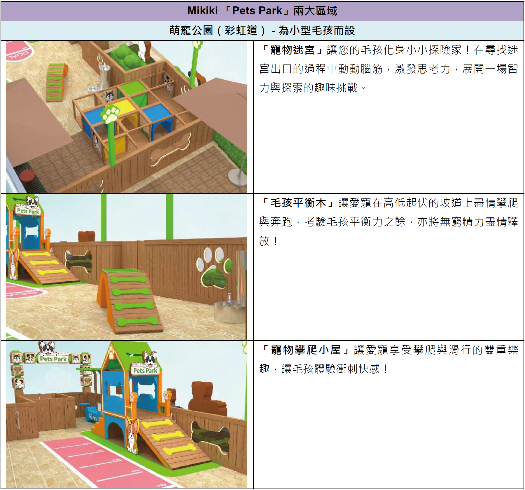 「Pets Park」劃分為兩大主題區域,分別為近彩虹道的「萌寵公園」及近太子道東的「毛孩玩樂長廊」。「萌寵公園」特別為小型毛孩設計,設有3大遊樂專區,分別有「寵物迷宮」「毛孩平衡木」及「寵物攀爬小屋」!而位於太子道東「毛孩玩樂長廊」則專為中大型寵物打造,設有5大遊樂設施,包括「跳圈圈」「考考平衡」「穿越大水管」「跨圈圈」及「繞着你走」,讓中大型犬盡情奔跑、全方位鍛煉毛孩體能、靈敏度及平衡力,絕對是市區最佳毛孩放電樂園!