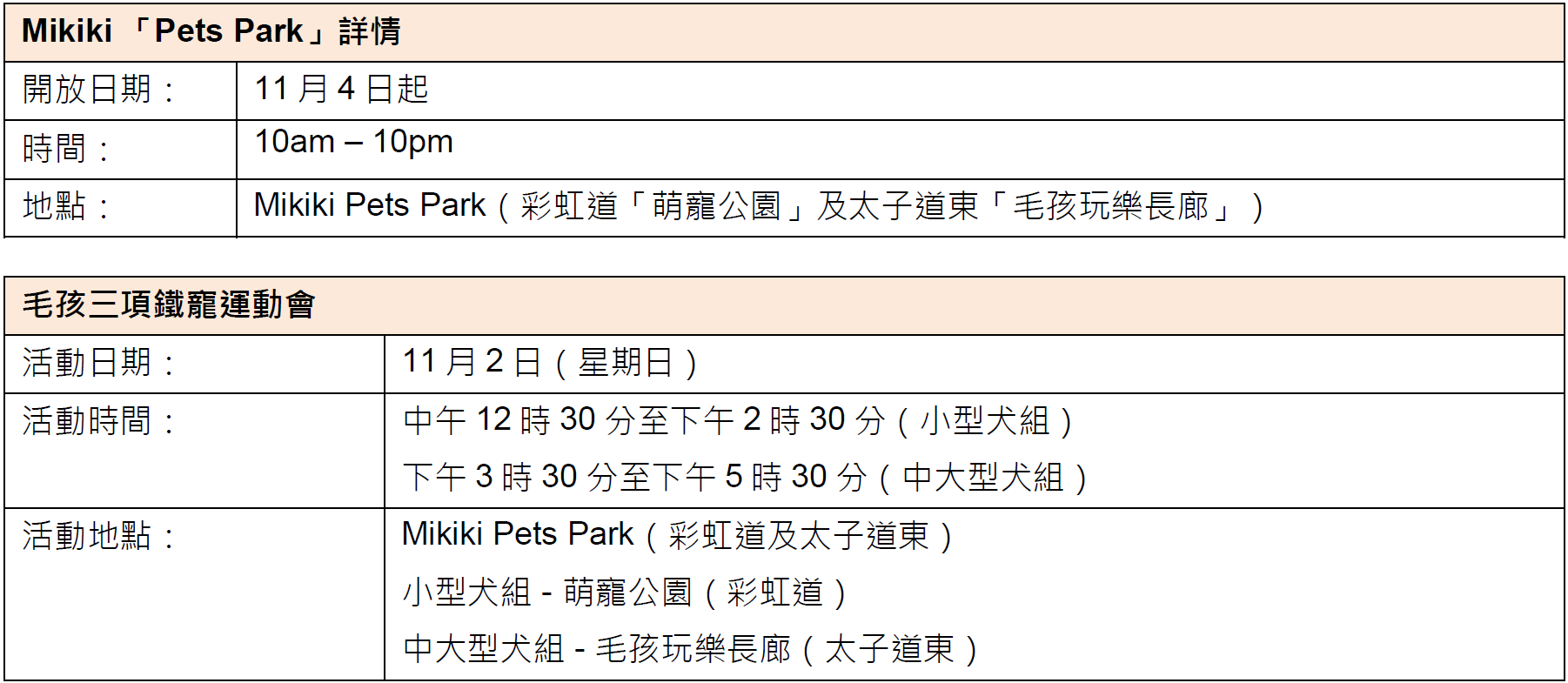 為慶祝Mikiki Pets Park開幕及配合全運會的熱烈氣氛,Mikiki特別聯乘本地人氣寵物資訊平台「毛孩街」,於11月2日舉辦全港首創的「毛孩三項鐵寵運動會」,賽事巧妙融入三項鐵人競技元素,召集全城精英毛孩一較高下。比場當日即場誕生「最強三項鐵寵運動健兒」,優勝者可獲得豐富獎品,一同見證毛孩榮耀時刻!