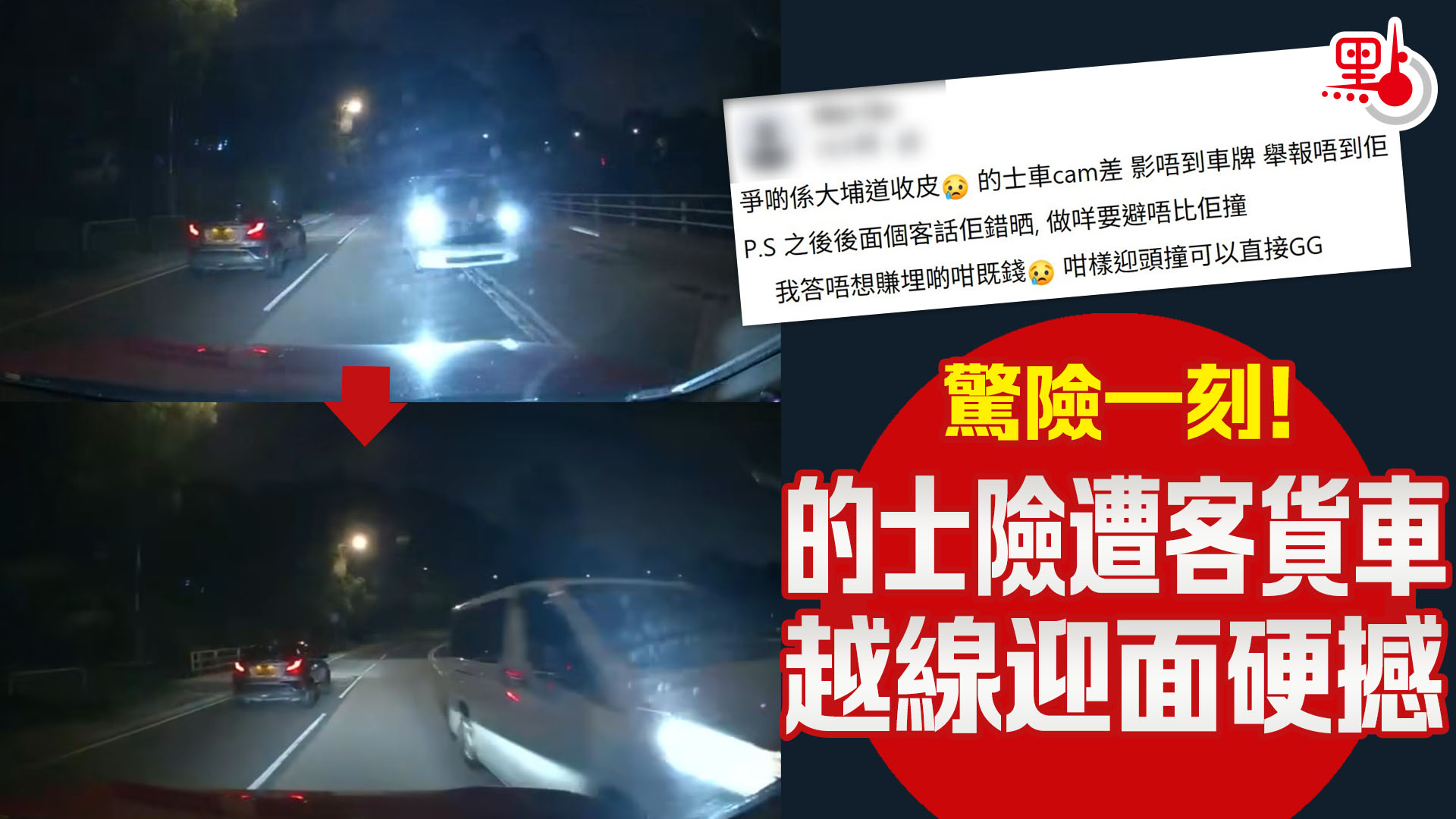 驚險一刻! 的士險遭客貨車越線迎面硬撼