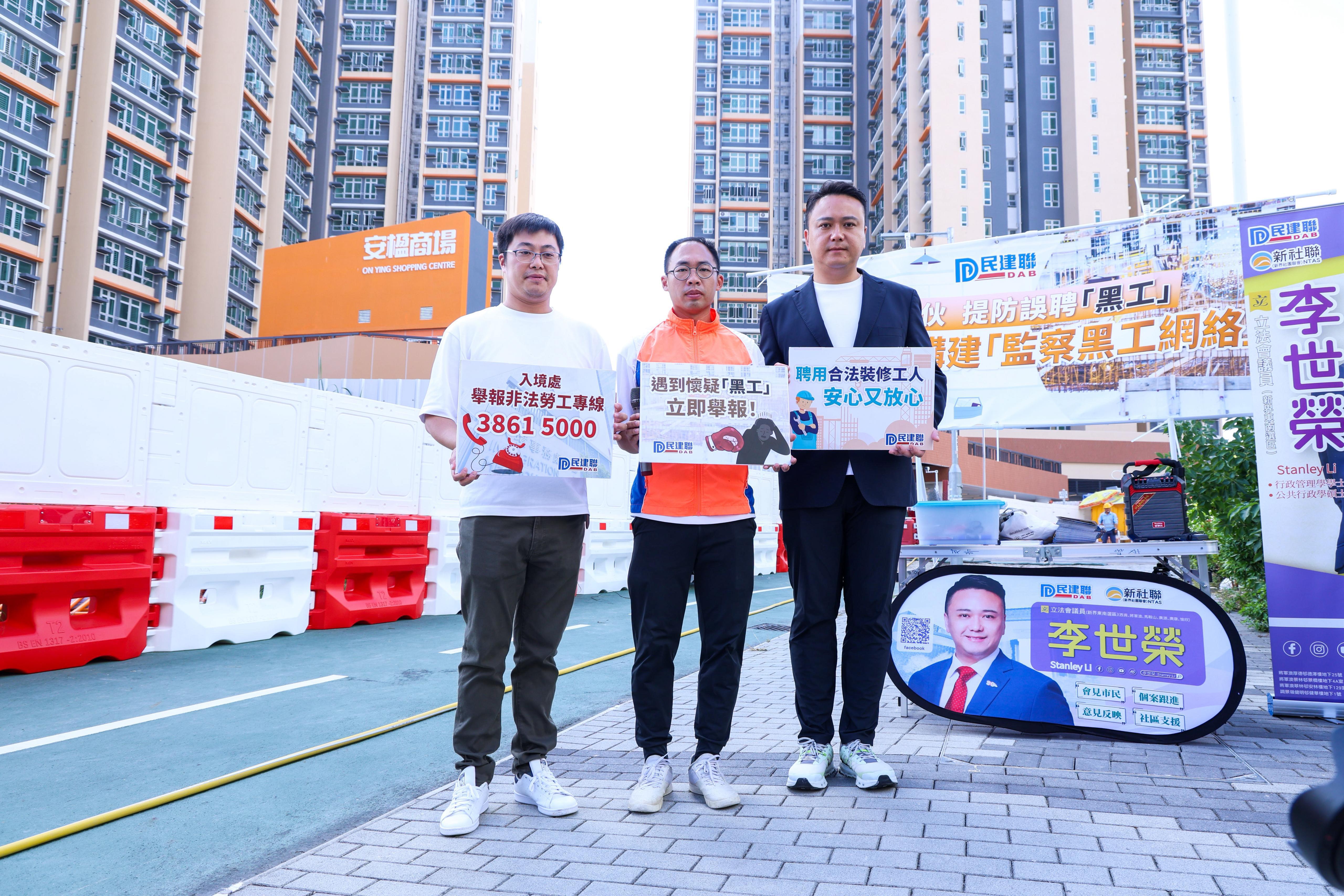 李世榮表示,安楹苑約有一千伙,業主本月初開始陸續收樓,正聯同民建聯團隊到區內協助居民收樓。團隊留意到不少業主會尋找公司裝修「安樂窩」,而早前入境處亦公布在一屋苑拘捕9名來自內地的裝修「黑工」及一名僱主,故向居民派發宣傳單張,提醒在光顧裝修公司或聘用師傅時須格外留神,避免聘用「黑工」而觸犯嚴重刑事罪行,即最高可被判入獄3年及罰款35萬元。他又提醒市民,即使尋找內地或外地的鄉親協助裝修工作,亦屬於違法行為。