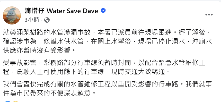 受事故影響,梨樹路部分行車線須暫時封閉,以配合緊急水管維修工程,駕駛人士可使用餘下的行車線,附近一帶交通大致暢通。水務署表示,會盡快完成有關的水管維修工程以重開受影響的行車路,並就事件為市民帶來的不便深表歉意。