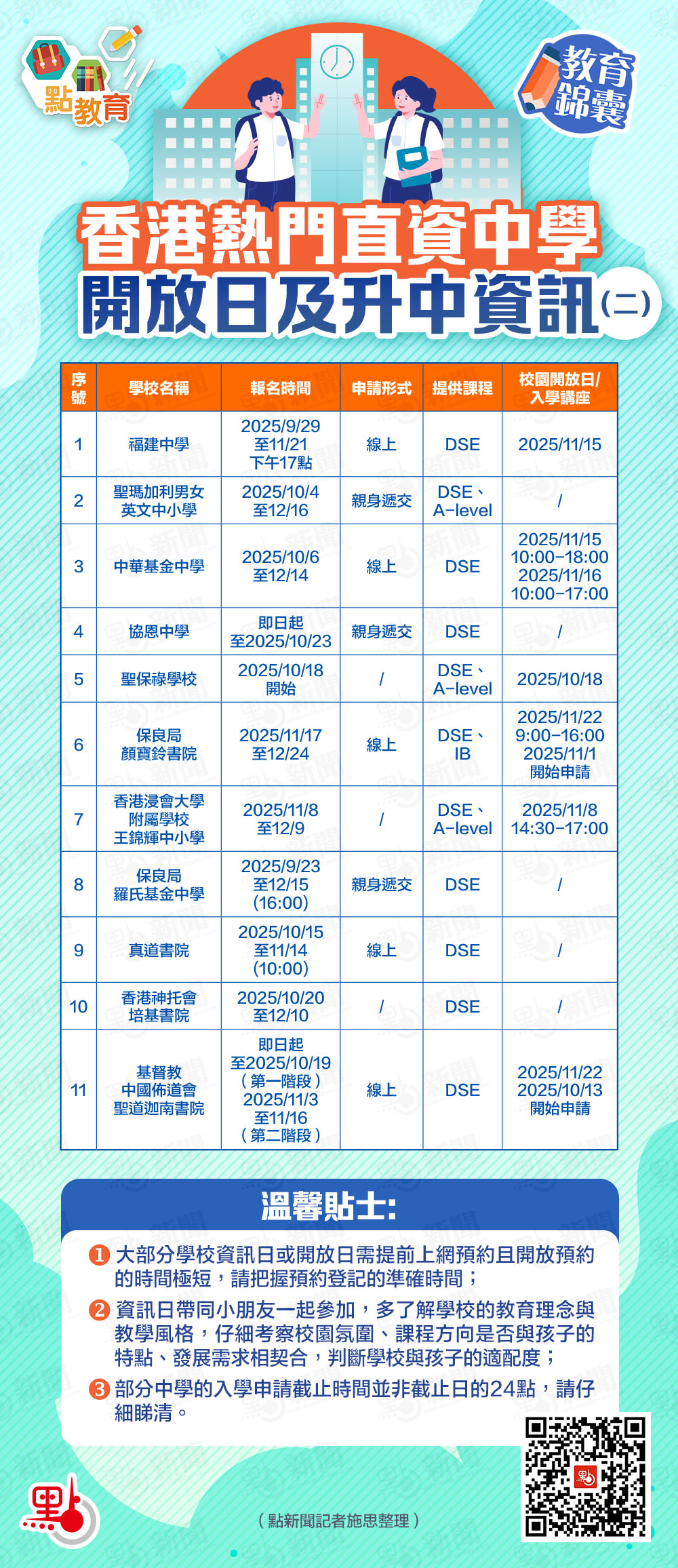 【點新聞報道】繼上一篇分享部分香港直資中學公布的中一入學申請及校園開放日安排後,又一批熱門直資中學升中資訊新鮮出爐,包含2026/27學年中一入學申請時間、申請方式、開放日詳情等,為家長及小六港寶提供更多升學選擇,助力港寶順利鋪排升中路徑。