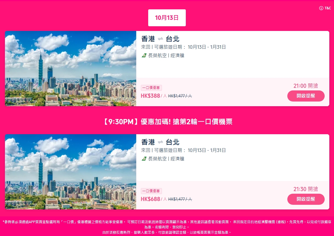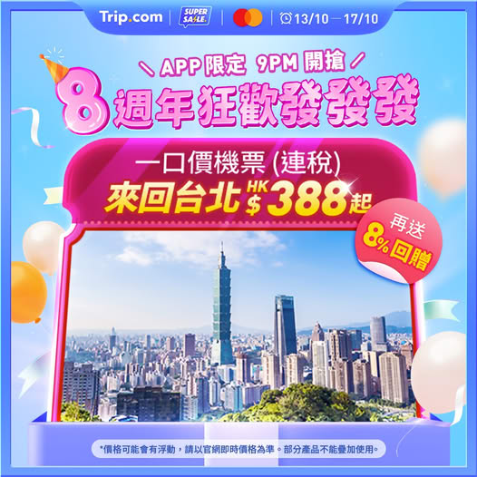 【點新聞報道】Trip.com推出一口價機票優惠,只要$388起就可以搭長榮航空飛台北。是次優惠活動分2個時間推出,今晚(13日)9時先推出一波$388來回優惠機票,半小時後再接再厲,晚9時30分則會推出$688來回優惠機票。