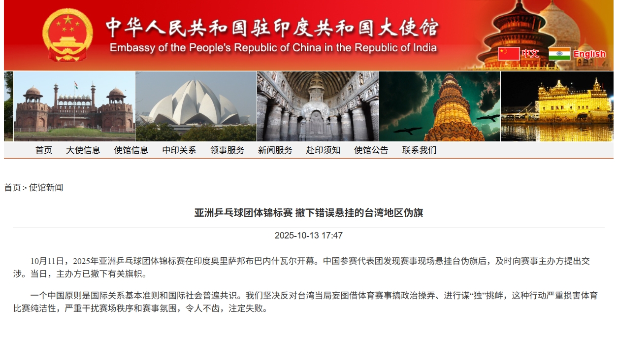 【點新聞報道】據中國駐印度大使館網站今日(13日)消息,10月11日,2025年亞洲乒乓球團體錦標賽在印度奧里薩邦布巴內什瓦爾開幕。中國參賽代表團發現賽事現場懸掛台偽旗後,及時向賽事主辦方提出交涉。當日,主辦方已撤下有關旗幟。