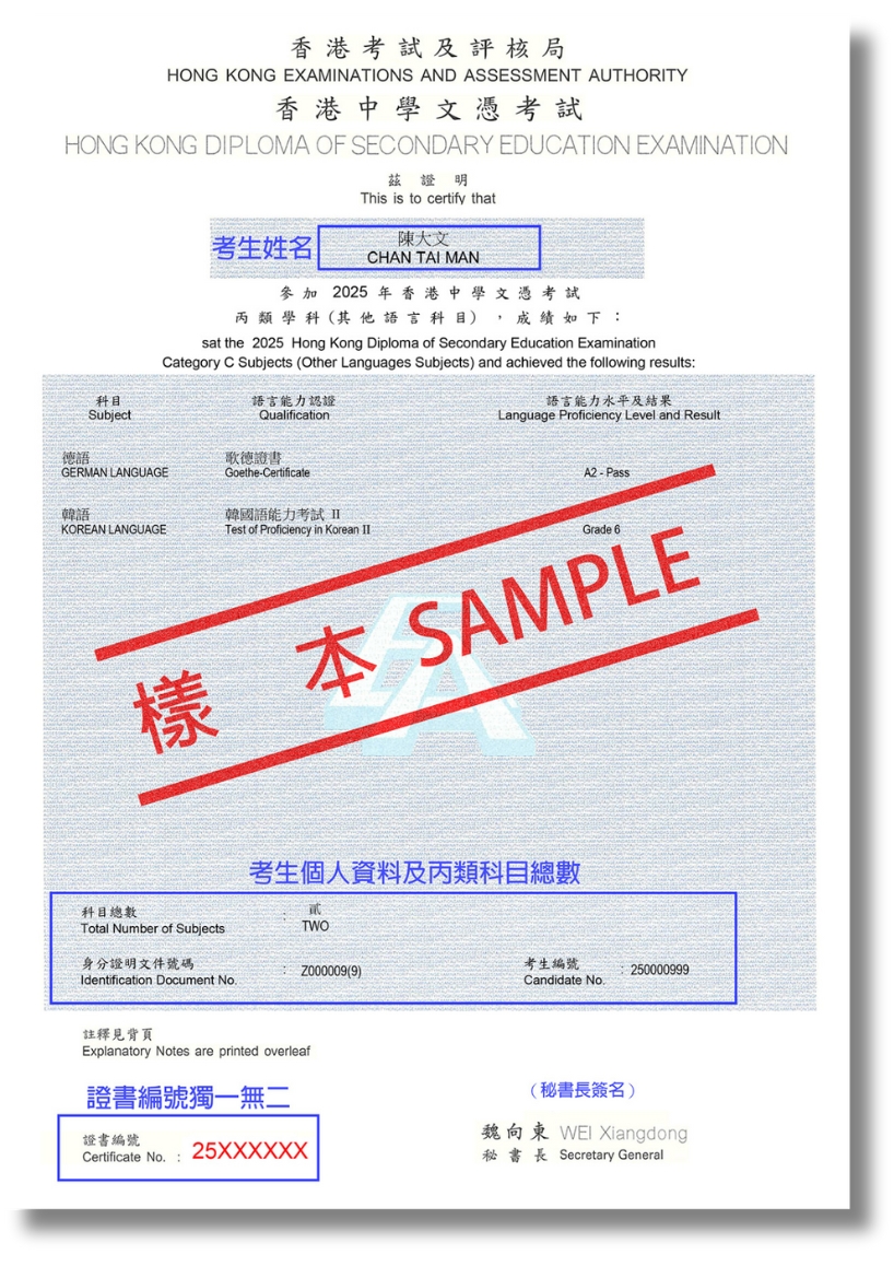 當收到證書後應核對個人資料,如需更正,考生需填妥更正資料申請表格,連同證書一併交回考評局。
