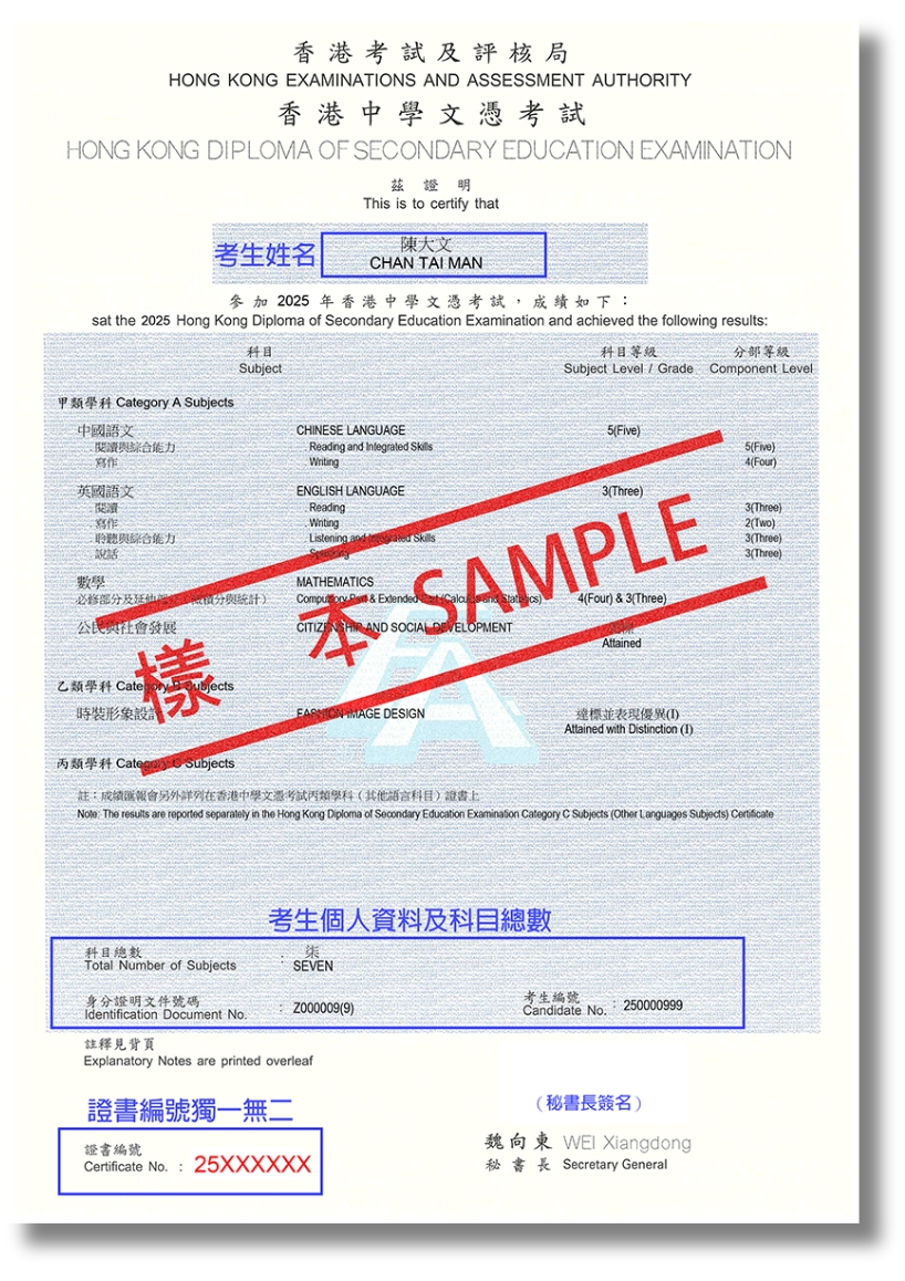 考評局提醒,每張DSE證書只會在考試當年向考生印發一次,上面印有獨立的證書編號及時任秘書長的簽名,每張均獨一無二,不設補領,如遺失相關考生只能申請成績證明文件。