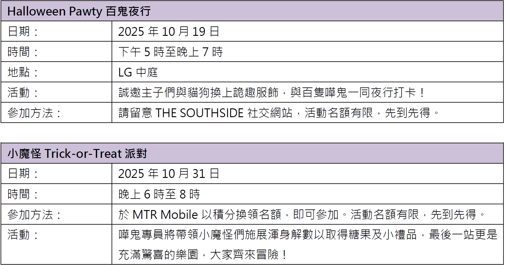 此外,THE SOUTHSIDE還將於10月25日舉辦「SOUTHSIDE廣東歌萬聖夜」,神秘廣東歌原唱歌手將驚喜現身。商場更有萬聖節特調飲品,讓大家一邊狂歡、一邊暢飲;更特別邀請專業舞蹈員及精心打扮的嘩鬼表演者帶來特色舞蹈演出,歡迎大小朋友換上創意服飾,一同投入這場音樂與詭趣交融的萬聖節狂歡!時間表如下: