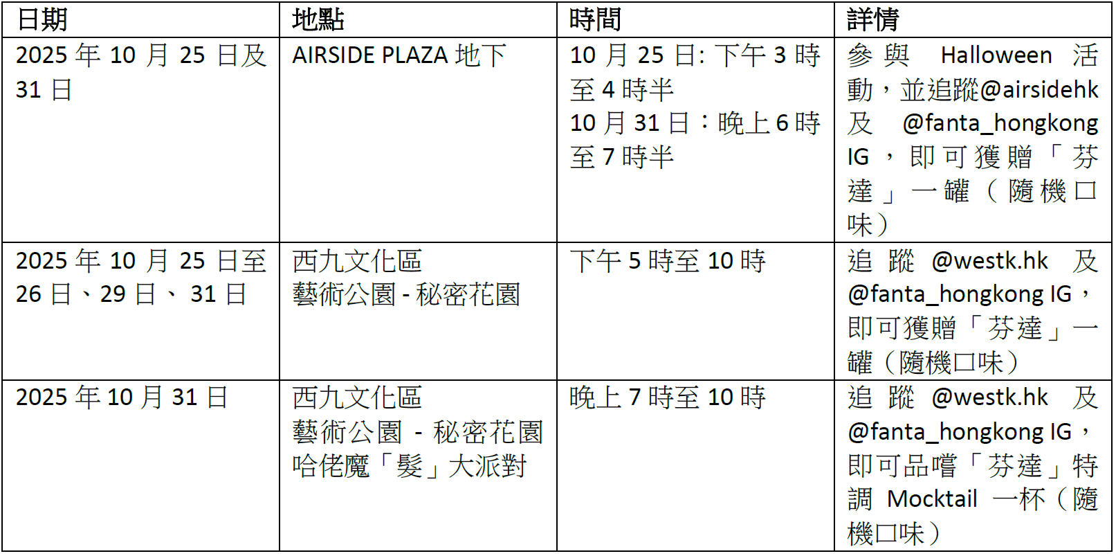 西九文化區及啟德AIRSIDE商場舉行萬聖節「芬達」驚喜派發活動,參加者只需完成指定任務,即可免費獲贈「芬達」隨機口味;而在萬聖節正日,西九文化區藝術公園秘密花園哈佬魔「髮」大派對更有「芬達」期間限定特調Mocktail!所有飲品數量有限,送完即止。