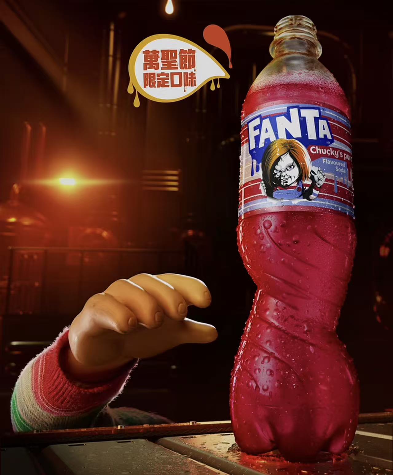 今次萬聖節「驚」喜再升級,震撼推出全新萬聖節限定「芬達」「Chucky」果味汽水,配合娃鬼卓奇經典造型,調配震「驚」血紅色口味汽水,搶眼奪目,入口爽爆果感。佛萊迪現身橙味包裝,美瑾化身提子味包裝主角。