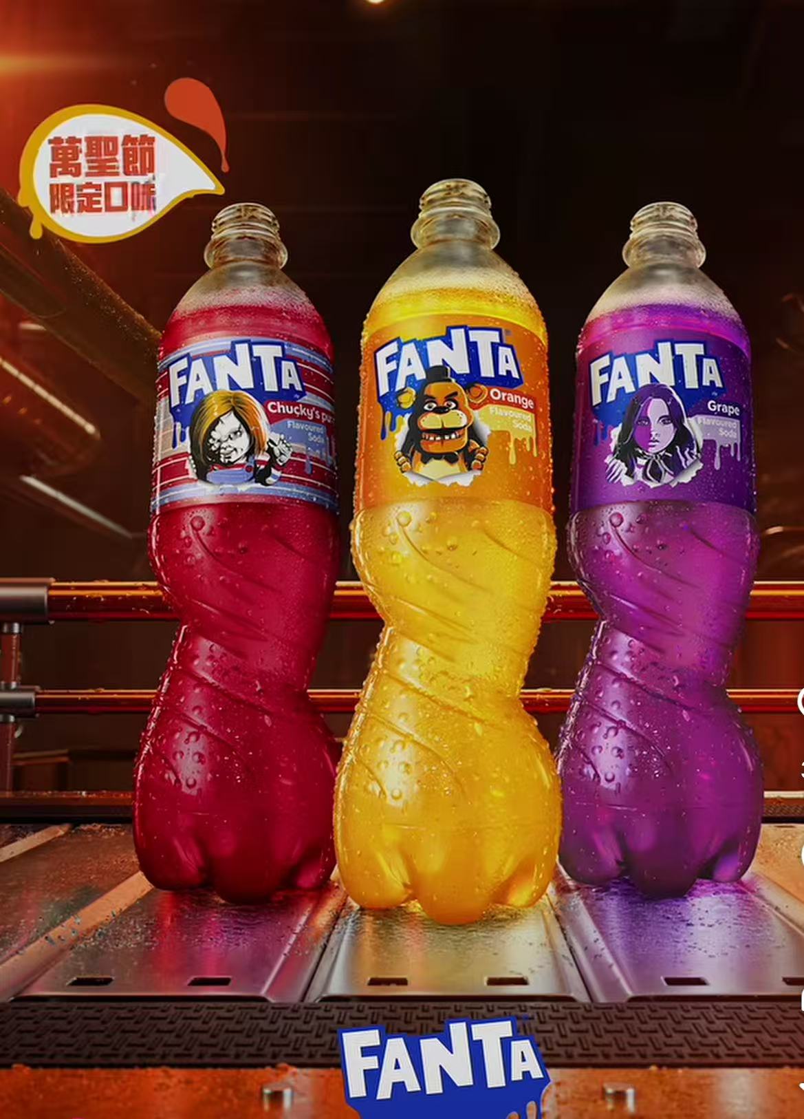 「芬達」聯乘環球影業召喚三大經典驚悚角色:《玩具熊的五夜驚魂》系列的佛萊迪、《人工殺姬》系列的智能邪娃美瑾,以及《娃鬼回魂》系列的娃鬼卓奇(Chucky),齊齊登上「芬達」全新萬聖節限定嘩鬼包裝!更有全新「芬達」萬聖節限定「Chucky」果味汽水震撼登場,全城嘩鬼,想飲就飲,一齊猛搶「芬達」!