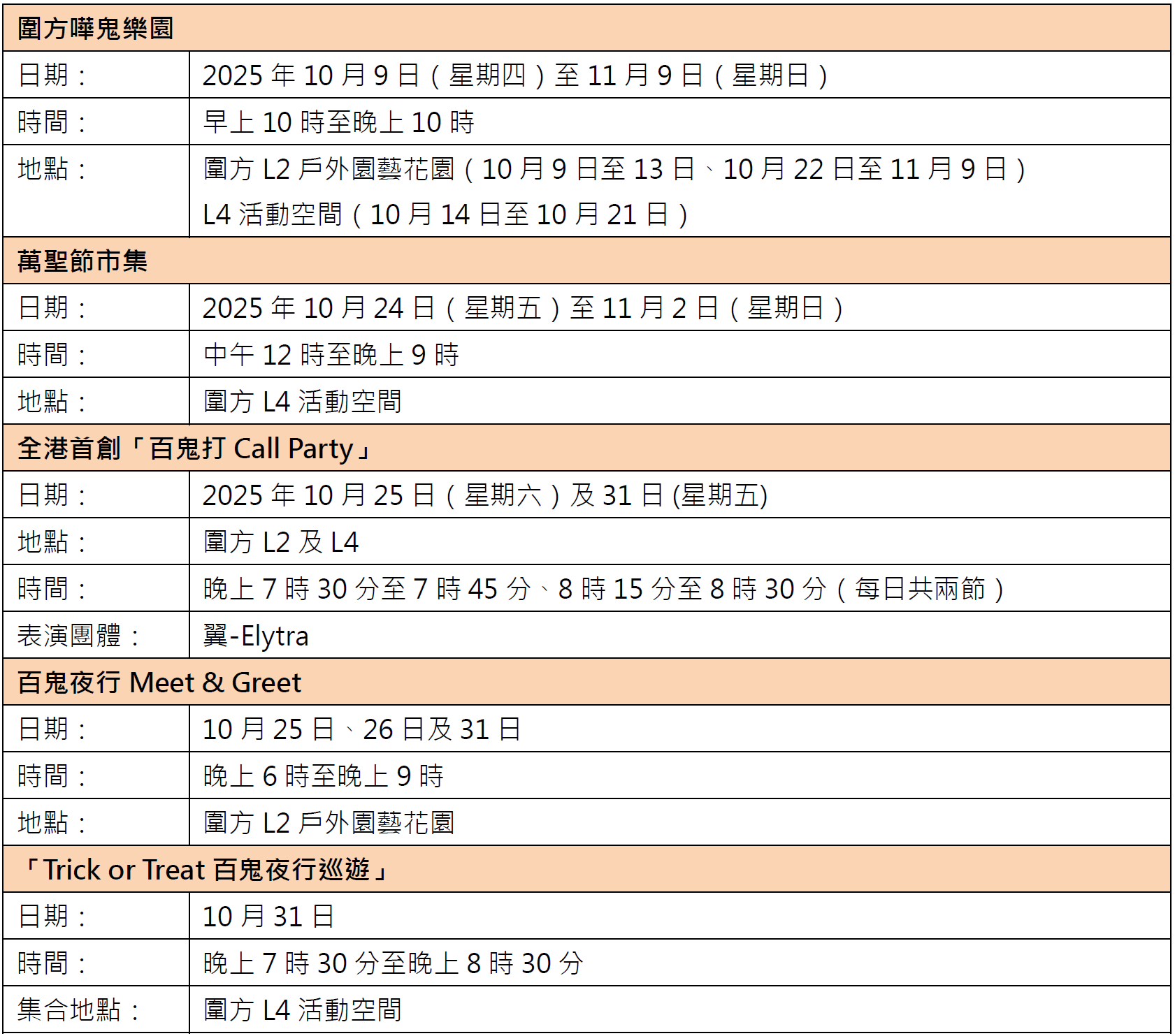 另外,場內更將舉行「百鬼夜行大巡遊」,眾多妖怪驚喜現身,與你近距離互動,誠邀你一同投入這個萬聖「鬼」馬派對!此外,在活動期間,商場將與場內餐飲商戶聯乘推出節日主題餐飲,不容錯過!時間表如下: