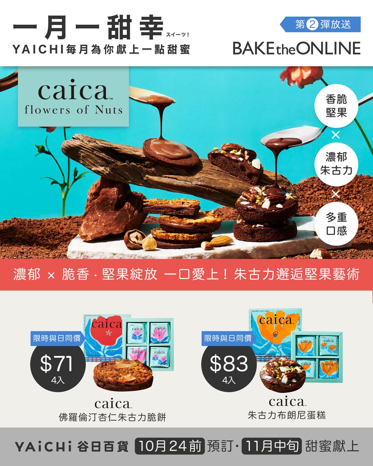 全港最大日本網上商場YAICHI穀日百貨,自9月推出「BAKE the ONLINE」日式甜品巡禮以來,憑藉四大日本人氣甜點品牌,掀起全城預購熱潮。繼首階段「BAKE CHEESE TART」與「PRESS BUTTER SAND」後,第二階段將於10月由堅果甜點專門店「caica」接力登場!