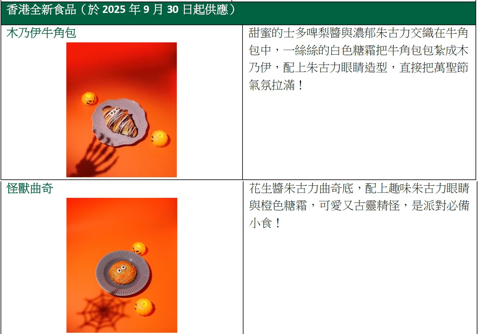 星巴克更於9月30日起推出萬聖系列全新小食:木乃伊牛角包,一絲絲的白色糖霜把牛角包包紮成木乃伊,配上朱古力眼睛造型,直接把萬聖節氣氛拉滿!怪獸曲奇的花生醬朱古力曲奇底,配上趣味朱古力眼睛與橙色糖霜,可愛又古靈精怪,是派對必備小食!