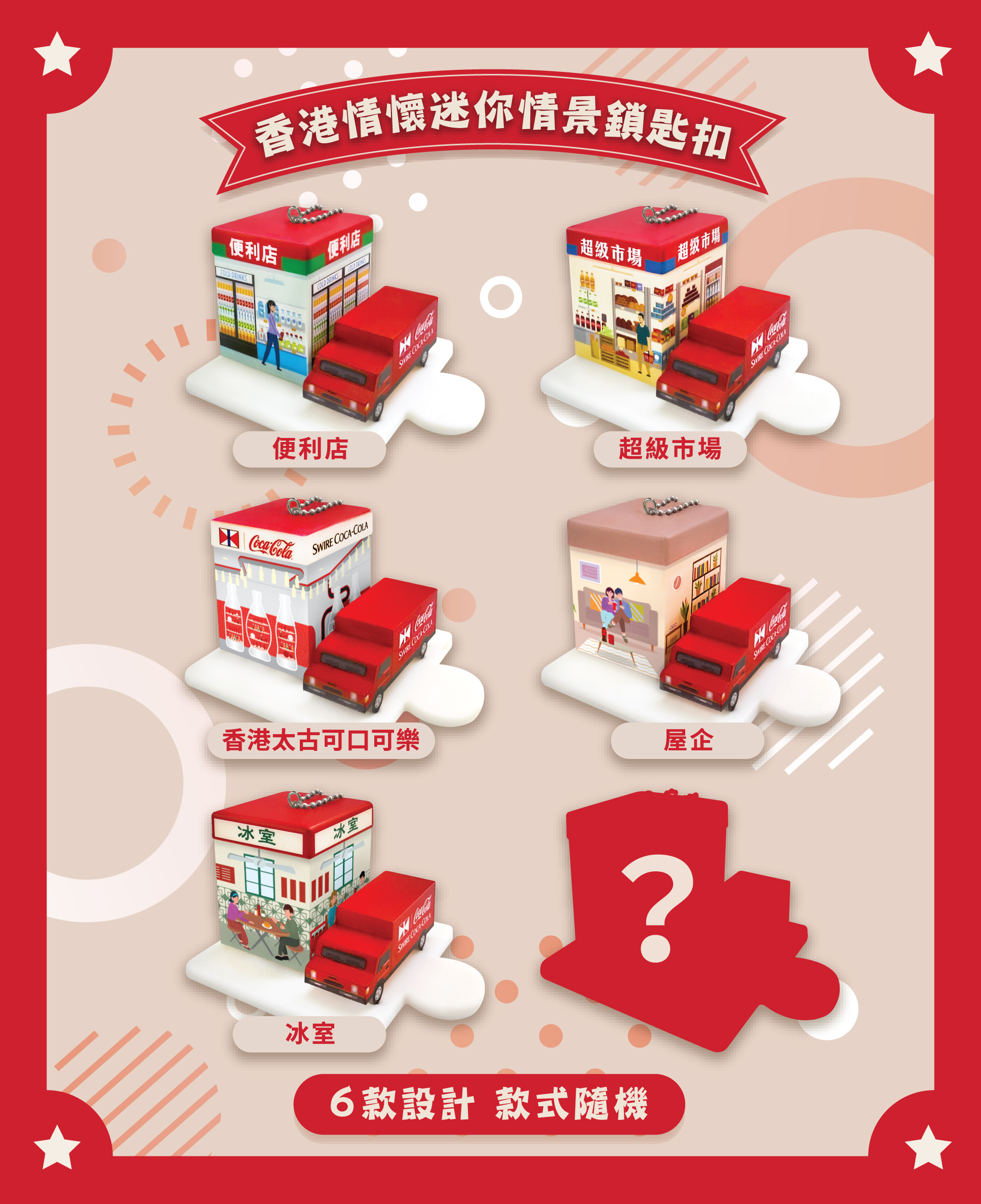此外,9月「換」樂驚喜更像飲品生產線一樣停不了!即日至10月31日,顧客於指定便利店、超級市場及網購平台等惠顧香港太古可口可樂指定產品/消費滿指定金額,即送全新推出「香港情懷迷你情境鎖匙扣」盲盒乙個,一套6款的鎖匙扣以經典香港場景作為設計,其中一款更是神秘隱藏版盲盒!數量有限,送完即止。