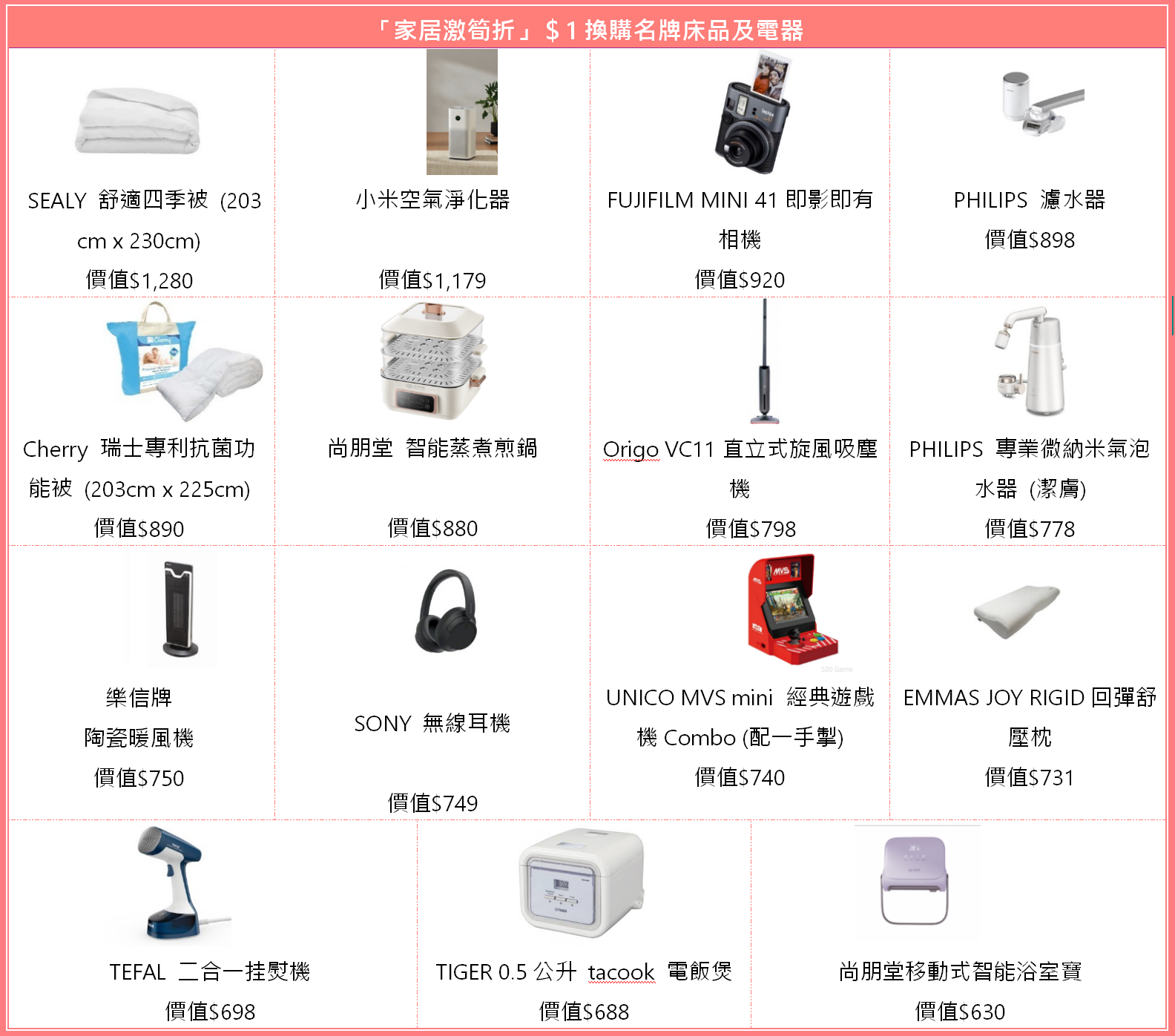 10月24日至11月30日「家居激筍折」,由超過20間人氣家居商戶聯乘打造的「家居激筍折」正式登場,場內精選貨品低至4折,更豪派HK$500立減優惠及高達HK$1500贈券福袋!而且於家居布置商戶累積消費滿指定金額,更可以$1換購名牌床品及電器,包括:SEALY舒適四季被、小米空氣淨化器、尚朋堂智能蒸煮煎鍋、FUJIFILM即影即有相機等,助你打造超高性價比的夢想安樂窩!