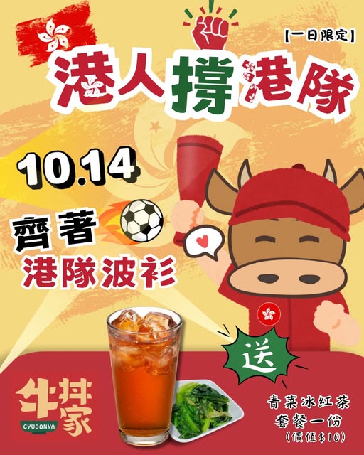 牛丼家推出港人撐港隊一日限定優惠,今日身上着香港足球隊波衫,到牛丼家分店惠顧滿$40,即送青菜冰紅茶套餐一份(價值$10)。