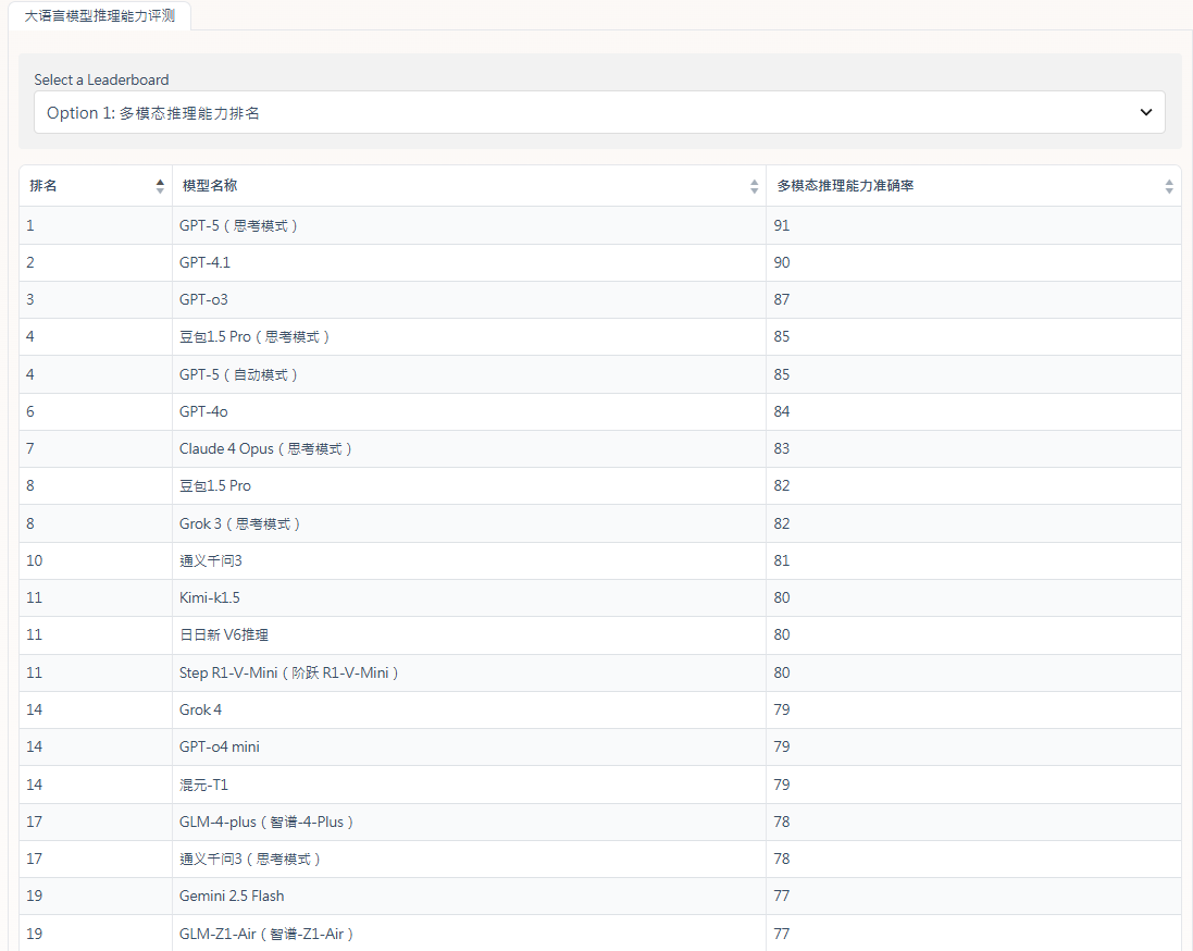 大語言模型在「多模態推理能力」上的表現出現明顯分層。其中,GPT系列展現出全面的領先優勢。內地研發的「豆包1.5 Pro」(思考模式)成為唯一打入前五名的國產模型,值得留意的是,其「通用模式」與「思考模式」的評分差距極小,證明其多模態推理的底層實力已達到國際頂尖水平。