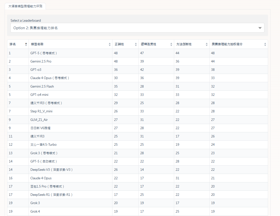 在「奧賽推理能力」方面,處於龍頭位置的是GPT-5(思考模式)和Gemini 2.5 Pro,以絕對優勢遙遙領先。至於國產模型的表現,「通義千問3」(思考模式)和Step R1_V_mini表現尚可,反映國產模型在處理頂尖複雜推理任務上,仍有相當大的進步空間。此外,即使是同一間公司旗下的模型,思考模式下的模型在各項奧賽推理維度上的表現,普遍優於其通用模型。