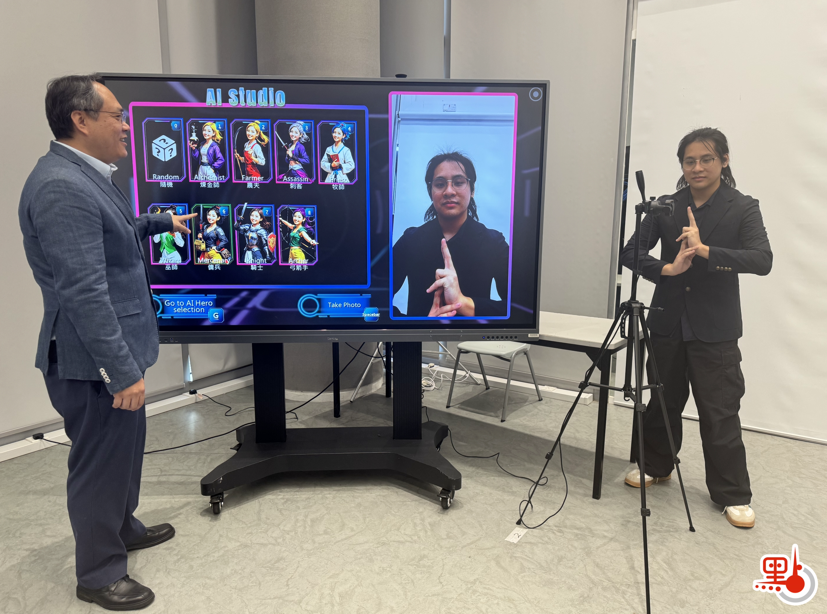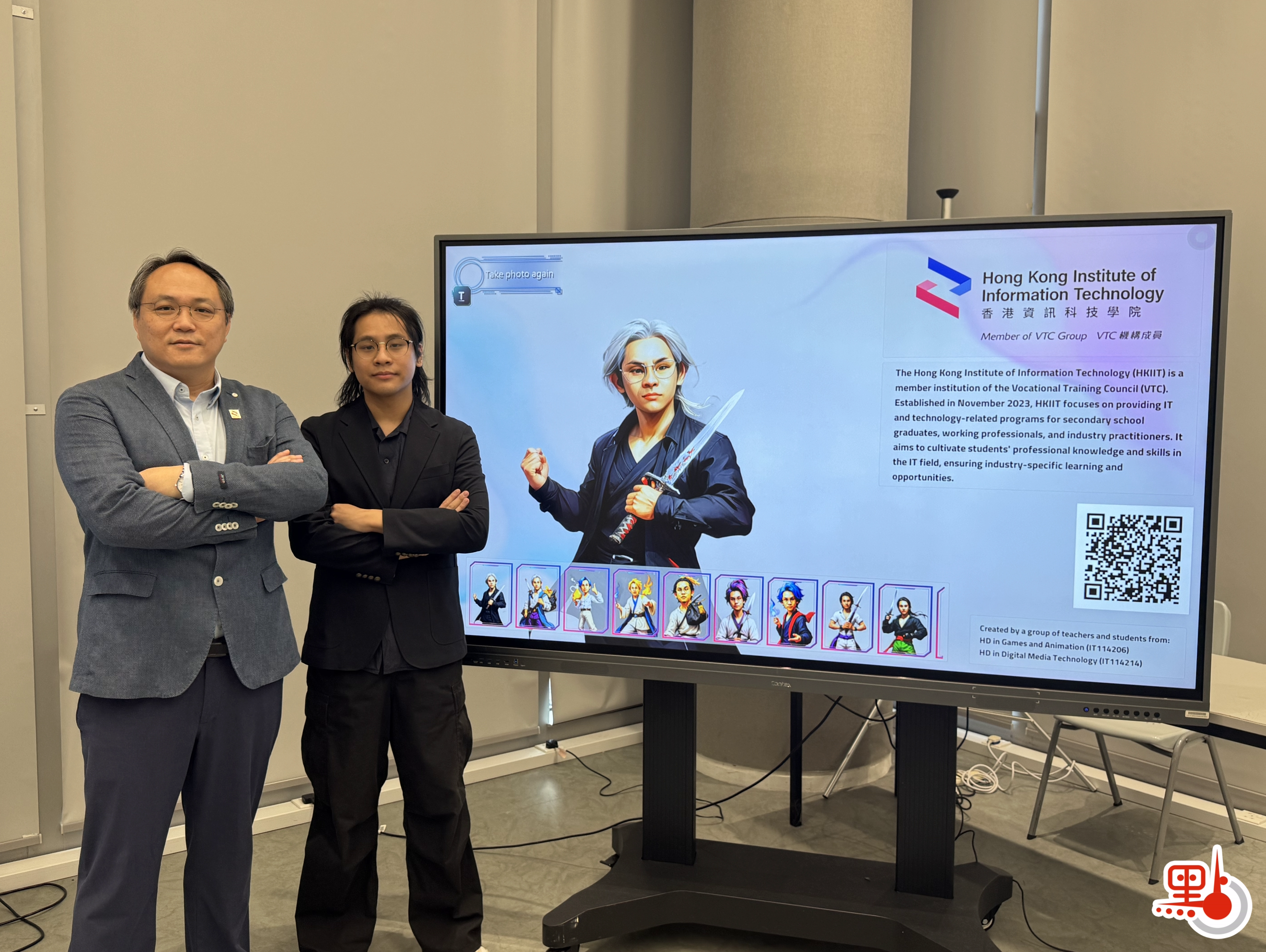 其中,「AI照相館」由香港資訊科技學院(HKIIT)遊戲及動畫高級文憑團隊設計完成,玩家只需面向鏡頭拍攝一張照片,系統就能以生成式AI驅動,根據玩家外貌、表情及衣着,於短時間內生成獨一無二的遊戲角色。HKIIT署理高級講師袁華秋介紹,其技術核心是HKIIT自行研發、以開源圖像生成的工具「Stable Diffusion」與大型語言模型(LLM),可省卻過往遊戲設計師繪圖所需的時間。他亦提到,為配合行業發展所需,HKIIT「遊戲及動畫高級文憑」課程亦加入了更多AI相關訓練,讓學生掌握使用AI輔助圖像設計、檢查程式編碼等實用技能。