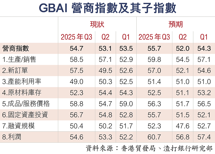 美國實施新一輪關稅戰,然而隨着粵港澳大灣區區域經濟一體化深化發揮作用,區內營商信心不減反增。渣打銀行與香港貿發局昨日聯合發布的渣打大灣區營商景氣指數(GBAI)調查顯示,關稅衝擊過後信心回復,期內中美延長關稅休戰期,外圍不明朗因素減少等帶動,區內企業對目前營商表現以至商業前景在第三季錄得全面改善,第三季營商活動的「現狀」指數由第二季的53.1升至54.7、「預期」指數由52升至55.7,分別創下4年及2年新高。製造業、貿易業及金融業復甦,香港的信心升幅最為強勁,「現狀」和「預期」指數在季內分別上升8.3和7.3個百分點,至52.2和53.6。