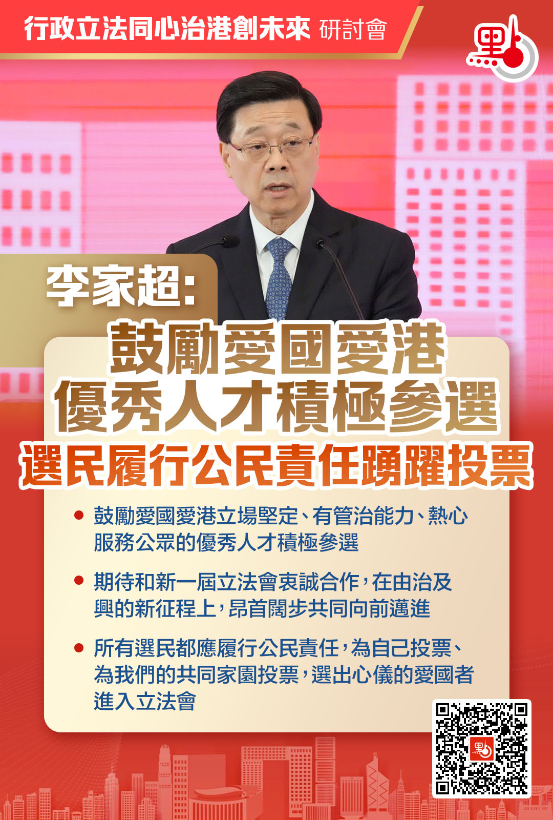 第八屆立法會選舉的提名期將於下星期五(10月24日)展開。我鼓勵愛國愛港立場堅定、有管治能力、熱心服務公眾的優秀人才積極參選。我期待和新一屆立法會衷誠合作,堅定在愛國者同一戰線上,凝聚改革共識,創新改革舉措,互相啟迪、相互砥礪,在由治及興的新征程上,共同昂首闊步向前邁進。