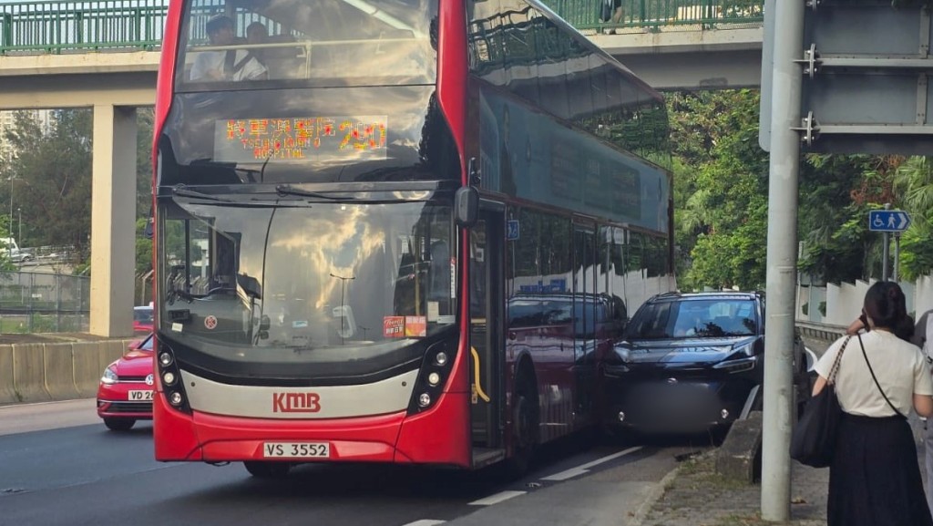 據了解,290線九巴沿慢線行駛準備進入巴士站,惟私家車突然由其左邊擠入,導致兩車相撞。巴士司機在場稱,當時載滿乘客,相撞時衝力非常大,導致車廂震動。私家車被卡在巴士左車身與欄桿之間,私家車右側車門無法打開,司機一度被困,報警求助。男司機獲救後輕傷,被送往明愛醫院治理。