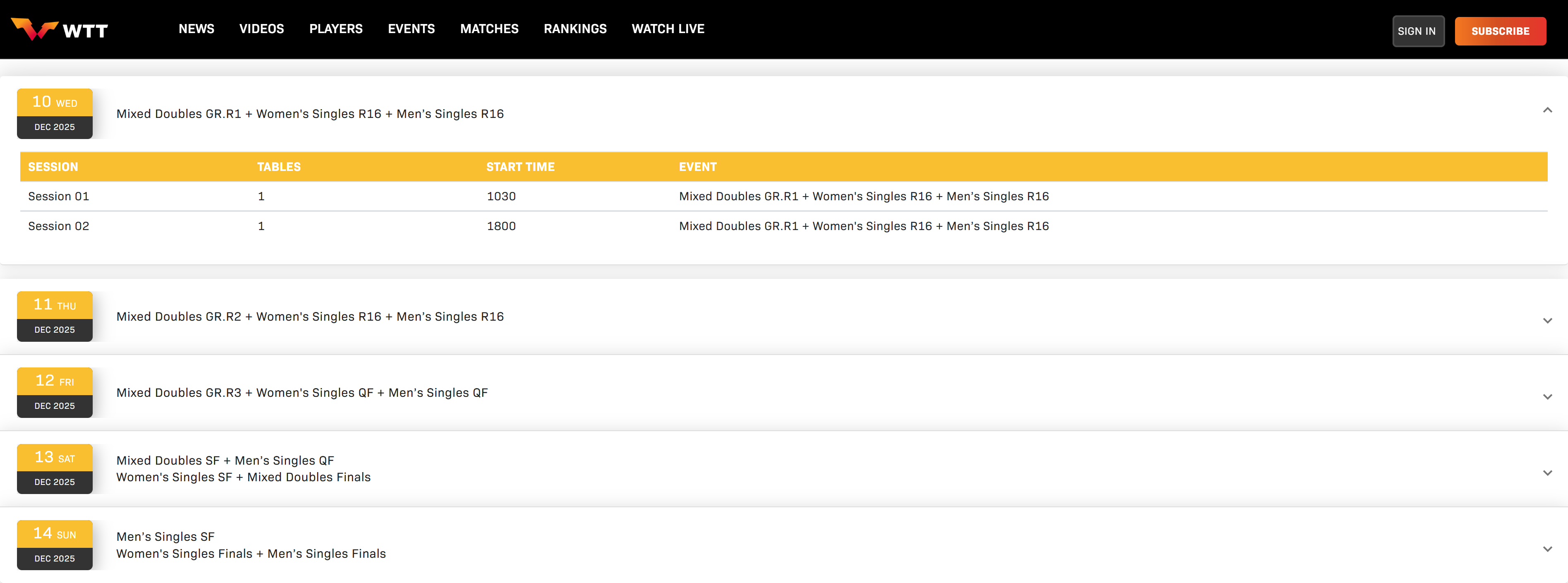 12月13日:混雙半決賽,男單1/4決賽,女單半決賽,混雙決賽;