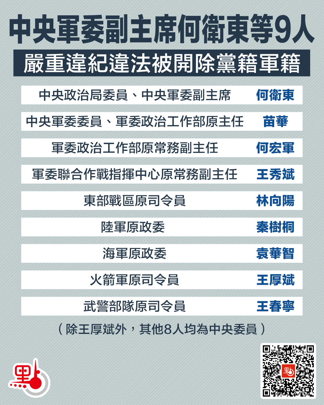 張曉剛表示,黨的十八大以來,全軍和武警部隊堅決貫徹黨中央、中央軍委決策指示,堅持無禁區、全覆蓋、零容忍,重拳懲貪肅腐,軍隊反腐敗鬥爭不斷向縱深推進。經黨中央、中央軍委批准,中央軍委紀委監委陸續對中央政治局委員、中央軍委副主席何衛東,中央軍委委員、軍委政治工作部原主任苗華,軍委政治工作部原常務副主任何宏軍,軍委聯合作戰指揮中心原常務副主任王秀斌,東部戰區原司令員林向陽、陸軍原政委秦樹桐、海軍原政委袁華智、火箭軍原司令員王厚斌、武警部隊原司令員王春寧9人立案審查調查。經查,這9人嚴重違反黨的紀律,涉嫌嚴重職務犯罪,數額特別巨大,性質極為嚴重,影響極其惡劣,依據相關黨內法規和法律法規,黨中央決定給予9人開除黨籍處分,將涉嫌犯罪問題移送軍事檢察機關依法審查起訴。其中,給予何衛東、苗華、何宏軍、王秀斌、林向陽、秦樹桐、袁華智、王春寧8名中央委員開除黨籍處分,待召開中央委員會全體會議時予以追認。此前,中央軍委已決定給予以上9人開除軍籍處分。