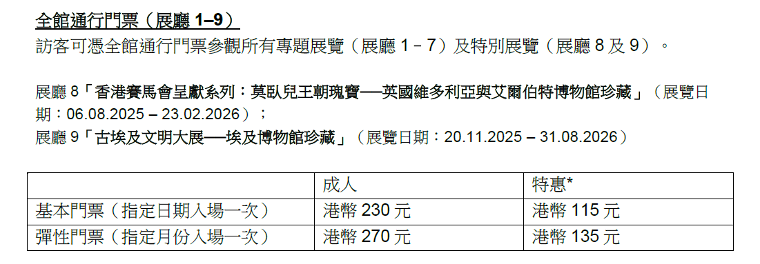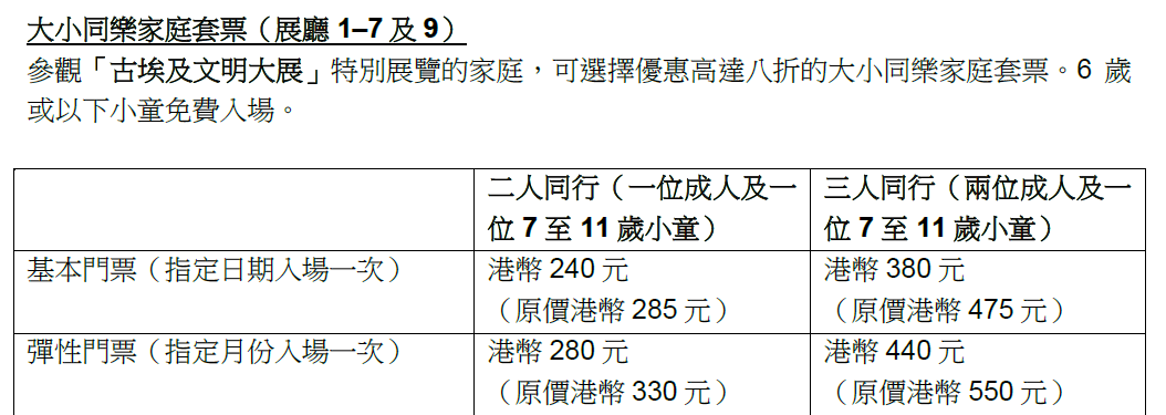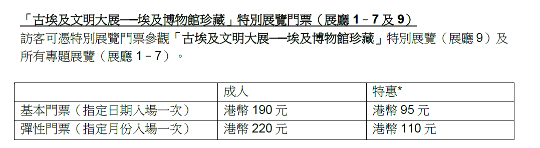 「古埃及文明大展」特別展覽的成人門票為港幣190元,特惠門票為港幣95元。博物館推出多款不同類型的優惠套票,包括首推「盲盒+展覽」套票,以及「香港故宮之友」新會員專屬古埃及主題特別版掛飾。門票將於10月22日(星期三)上午10時正式開售。點擊連結購票