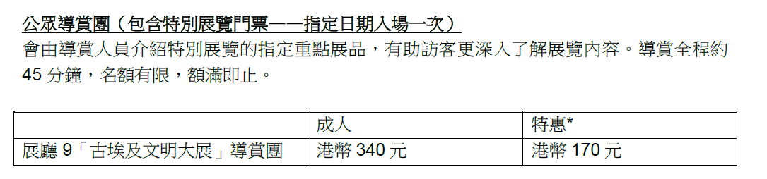 此外,參觀者可預約參加此特別展覽的公眾導賞團,包含一張特別展覽成人門票或特惠門票的導賞團套票分別為港幣340元及港幣170元。導賞全程約45分鐘,名額有限,額滿即止。