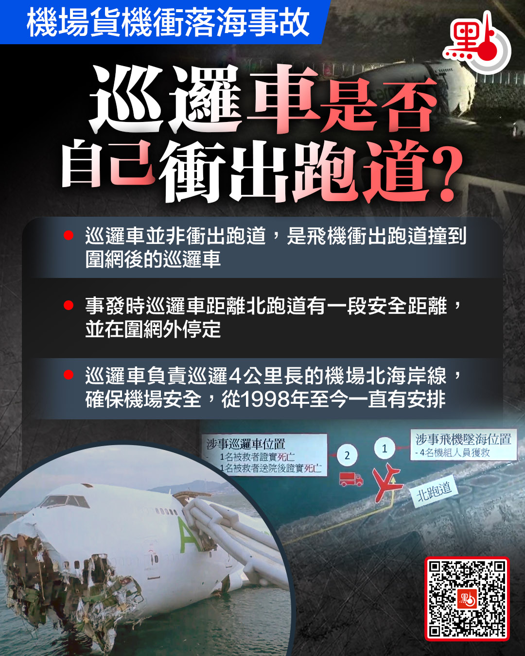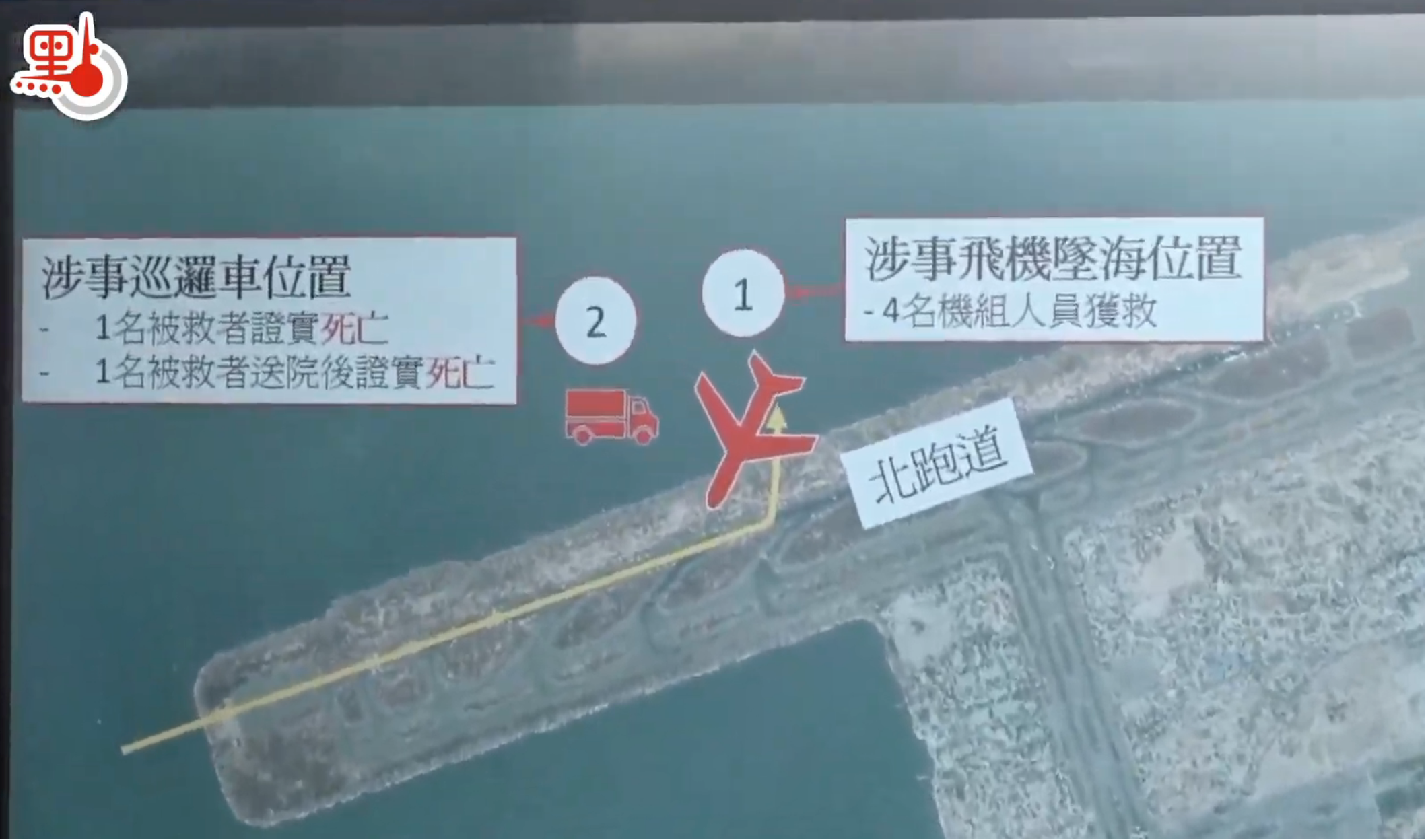 【點新聞報道】香港國際機場今日(20日)凌晨發生罕見事故,一架由杜拜抵港的貨機降落期間,懷疑衝出跑道墮入海中,一輛機場地勤車懷疑被撞,車上兩人一度墮海失蹤,之後地勤車30歲乘客被救起後當場證實不治,40多歲司機送院後死亡。機管局今日上午就貨機降落後滑出海面的事故見記者,交代最新情況。