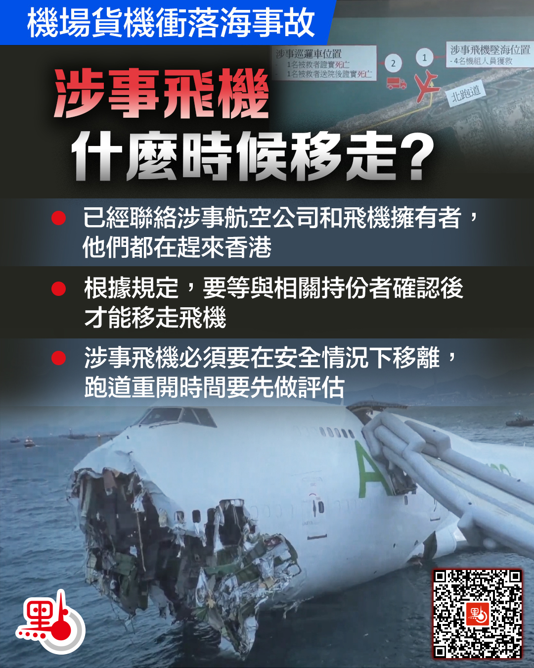 被問及涉事飛機何時打撈及移離現場,以及機場北跑道何時重開,香港機場管理局機場運行執行總監姚兆聰回應表示,涉事飛機必須要在安全情況下移離,跑道重開時間要先做評估。他強調出事飛機是否被移離並非最重要,而是要符合飛機降落的安全系數,包括對機師及其他民航系統的影響。