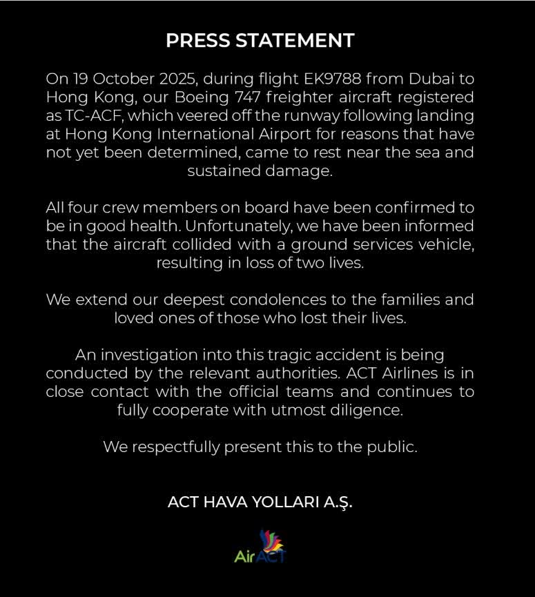經營涉事貨機的土耳其ACT Airlines發表聲明,表示對事故中兩名死者的家屬和親友,致以最深切哀悼和慰問,並會就事故調查與有關當局全力合作。相關部門正對今次事故展開調查,ACT Airlines正與官方團隊保持密切聯繫,並繼續全力配合調查工作。