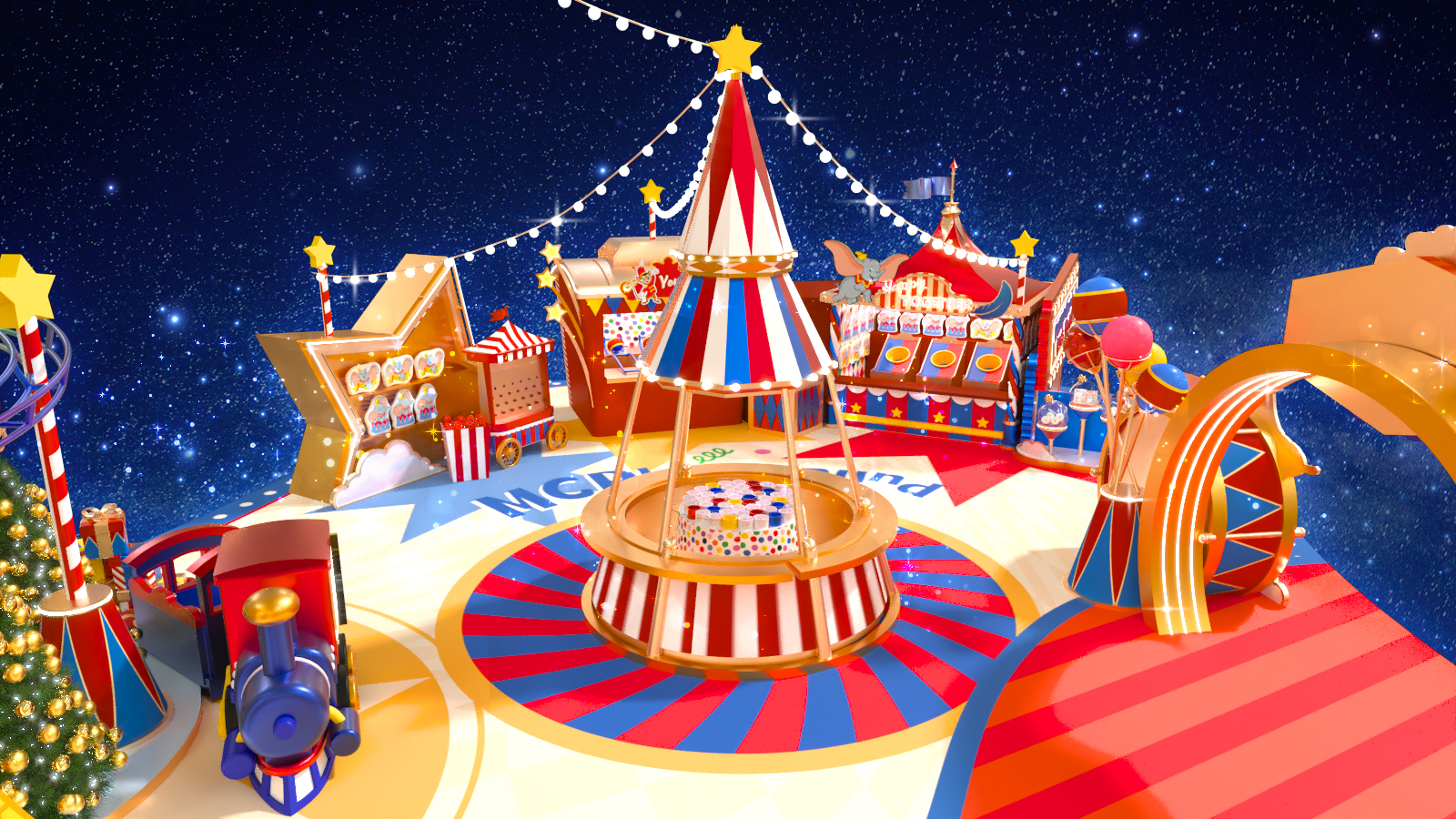 穿過馬戲門廊,就可以看到馬戲帳幕內小飛象裝置已經準備就緒,為大家帶來「精彩表演」。而帳幕上的9米高巨型「閃爍星光聖誕樹」,以及兩旁簇擁着小飛象裝置的聖誕森林樹群,洋溢濃厚節日氣氛!