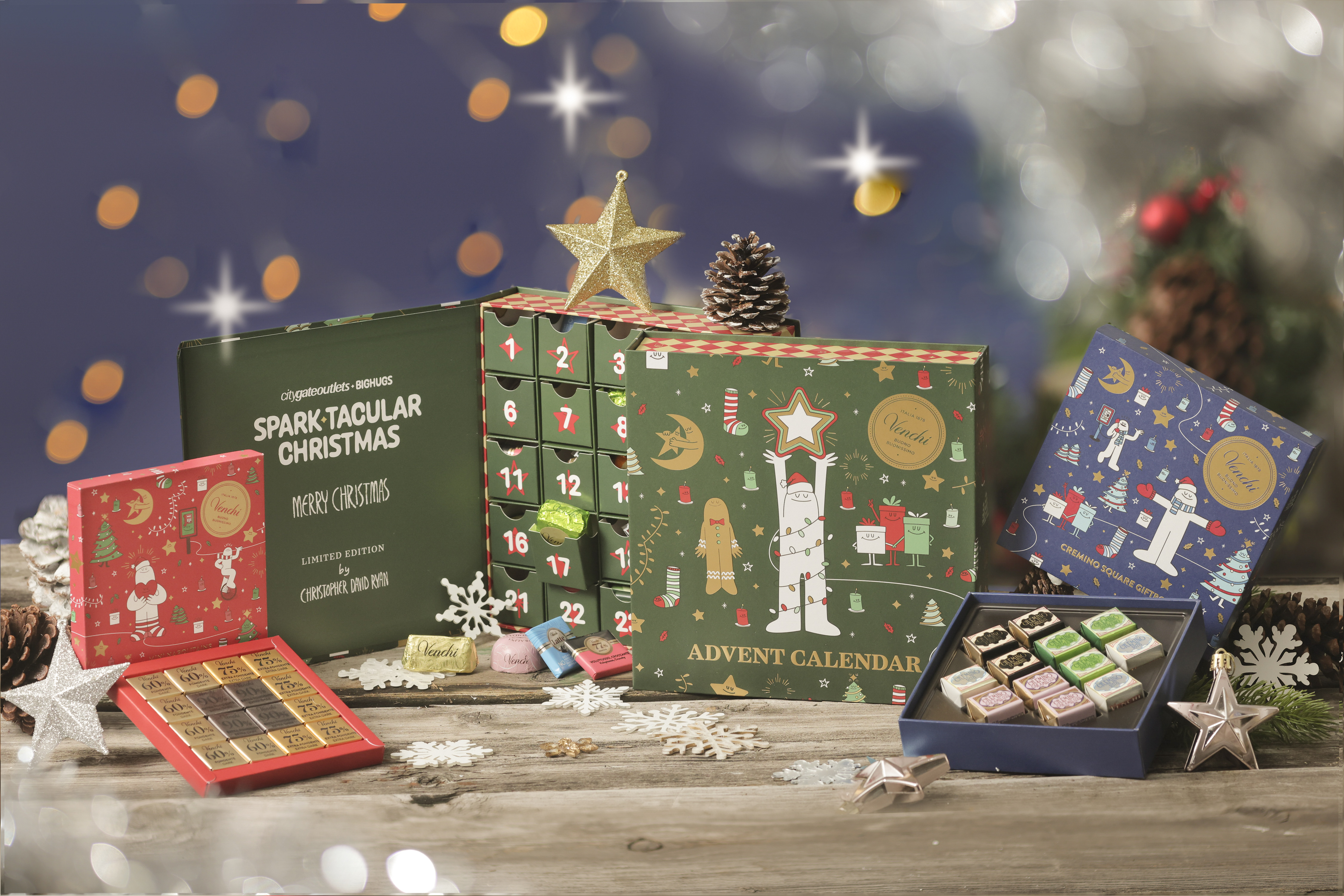 東薈城名店倉亦為各位CLUB CG會員準備了「聖誕『星』級三重賞」,凡於指定商戶即日以電子貨幣消費滿指定金額,即可換領指定BIG HUGS抱抱人限定版Venchi巧克力禮盒及無消費門檻之商場電子現金券。非CLUB CG會員亦可憑HK$2,000或以上合資格之即日單一電子消費,即場登記成為會員並獲得獎賞禮遇。