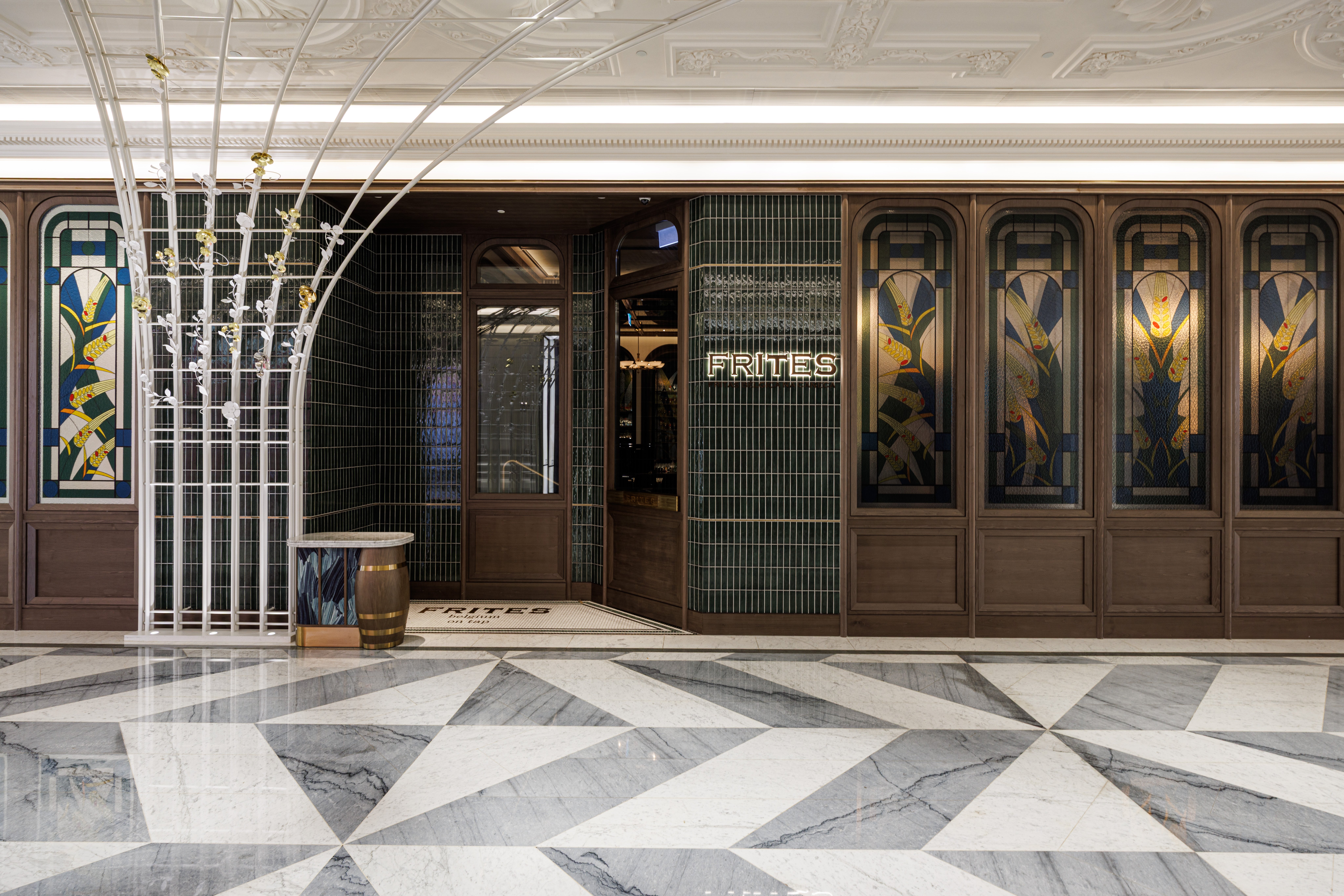 FRITES Belgium on Tap澳門將香港分店標誌性的藝術設計元素巧妙升級,包括璀璨奪目的吊燈、華麗的歐洲彩繪玻璃、高聳的天花板,以及1920年代裝飾派藝術風格,營造出瑰麗且精緻的氛圍。