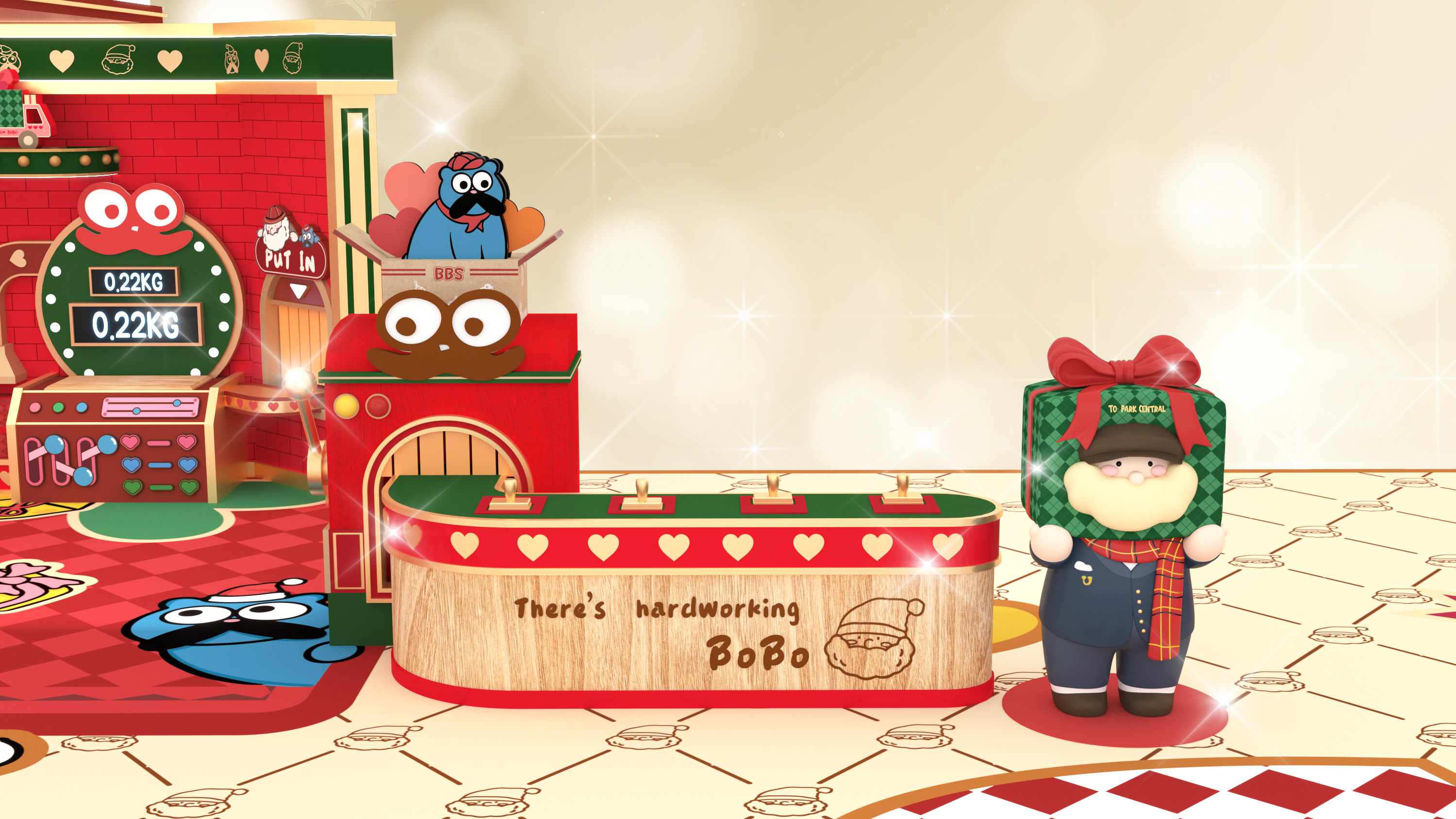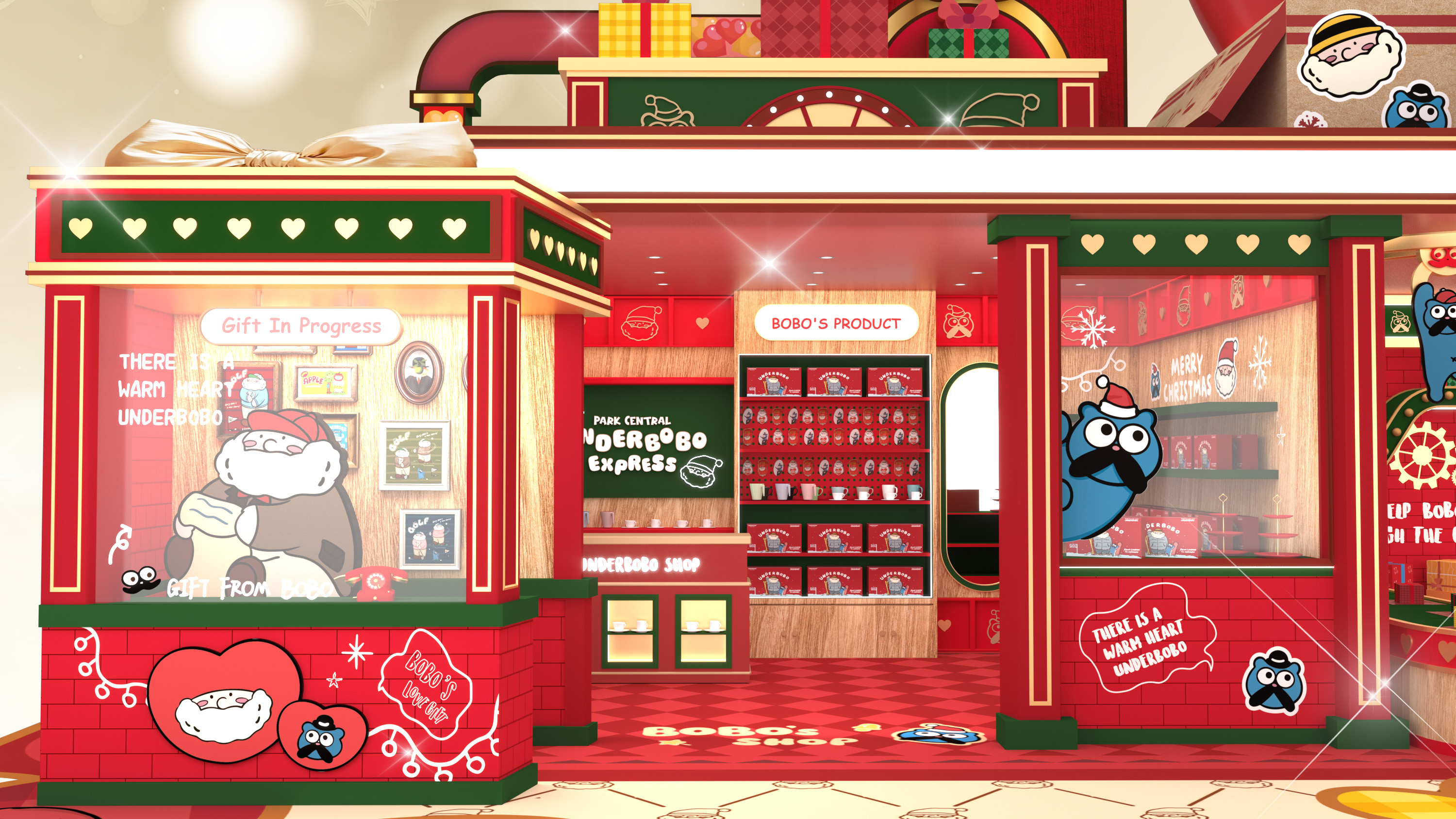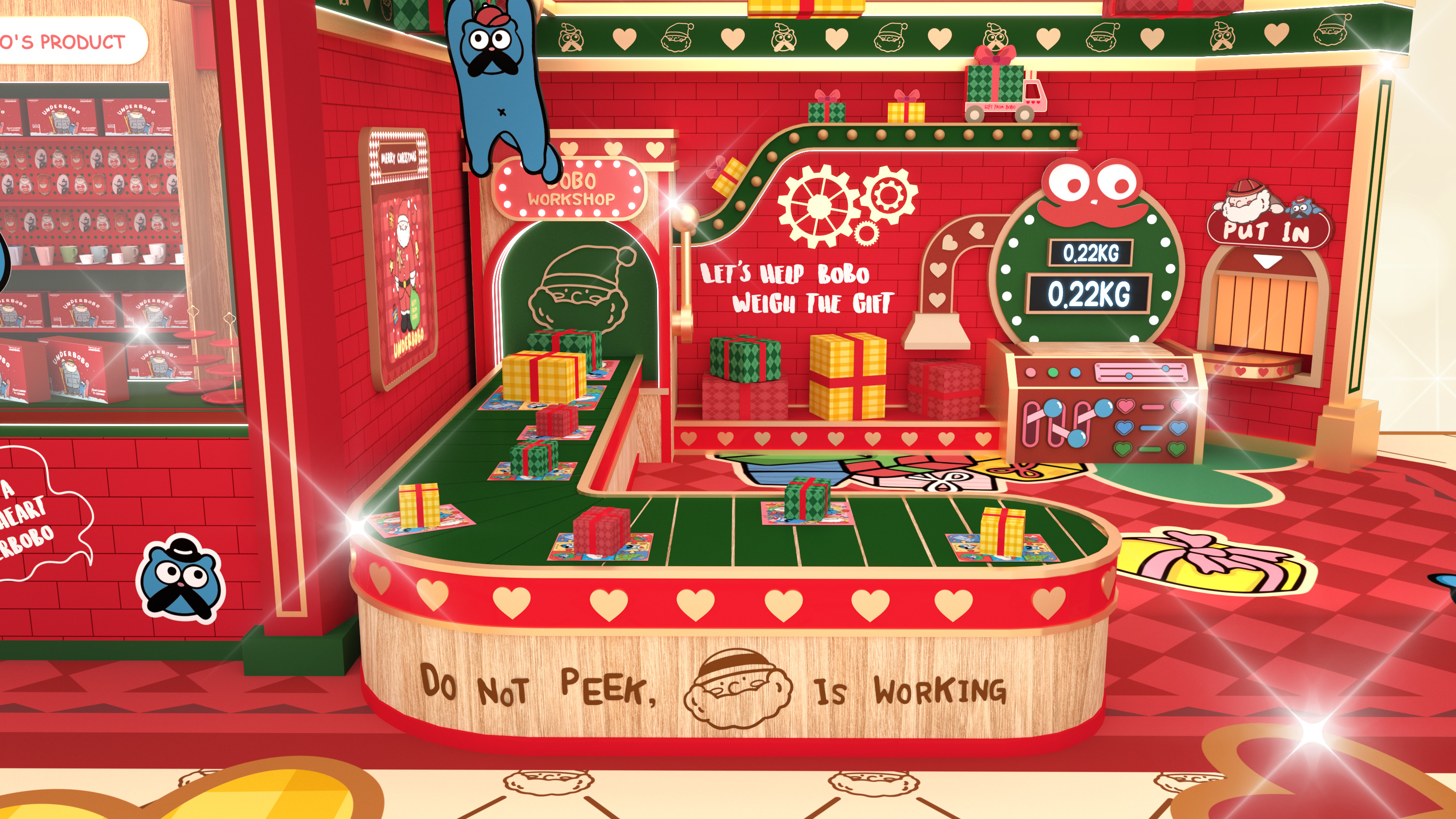 魔法禮物工場設有7大超吸睛打卡場景,包括:2.5米高巨型UNDERBOBO及可愛貓咪BOZO,2位萌爆角色正熱情地向大家揮手;至於鬼馬的小朋友則萬勿錯過「UNDERBOBO鬼馬哈哈鏡」的趣味扭曲效果,笑鬧中捕捉搞怪瞬間;走進「聖誕老人辦公室」,一起為聖誕老人分擔忙碌工作;「藍色貓貓BOZO衣帽間」則讓你化身精靈,試穿可愛配件,打造派對最佳TOTAL LOOK!另一邊廂,1.3米高全新英倫紳士造型現身的UNDERBOBO正趕緊於佳節前派送禮物,推着聖誕禮物車穿梭;場內更有高達2.8米的炫亮聖誕樹,快來打卡!