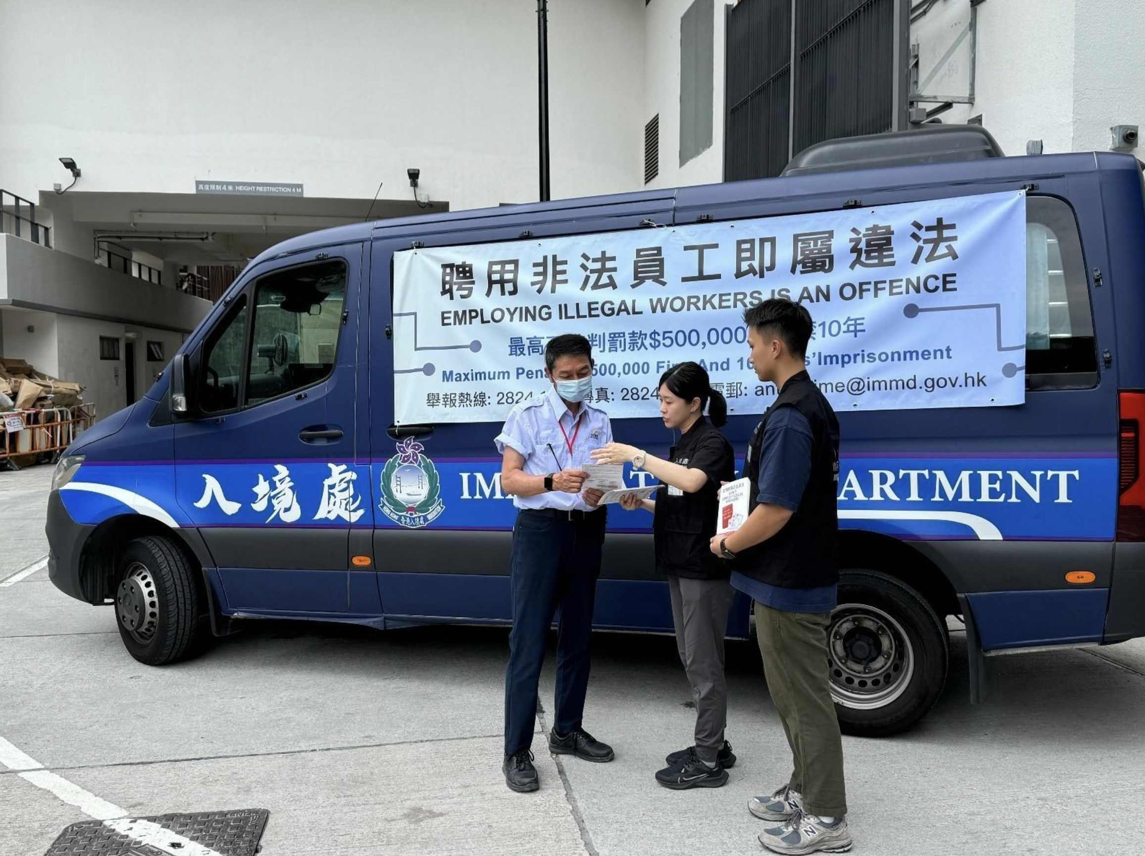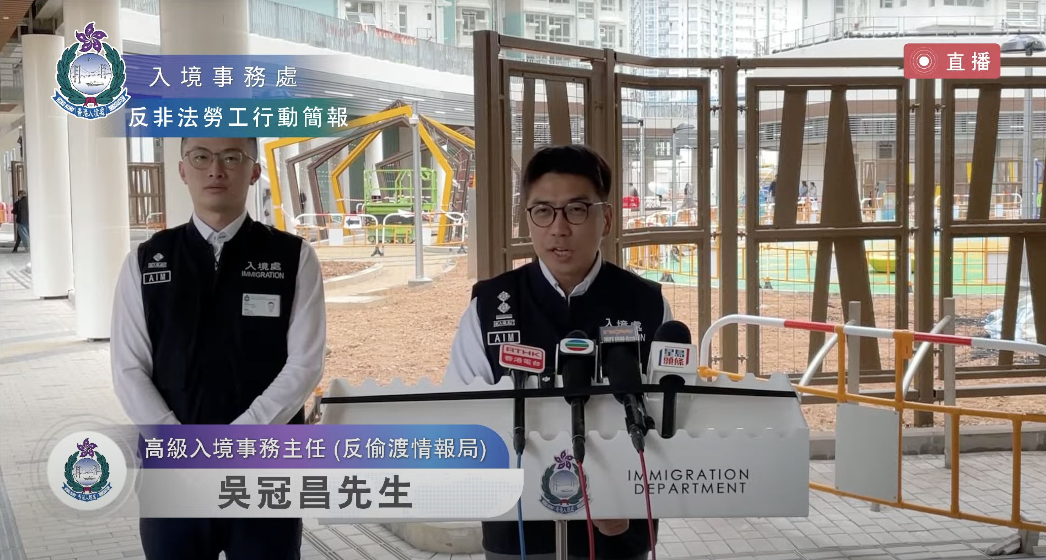 入境處今日(21日)下午舉行記者會,簡介早前進行的反非法勞工行動。入境處於10月20日至21日在東涌一個新入伙屋邨展開行動,突擊搜查逾150個住宅單位,在其中5個單位內,拘捕7名非法勞工及3名涉嫌聘用非法勞工的僱主。黑工以旅客身份抵港工作,薪水以現金形式發放,日薪為600至800元不等。被捕非法裝修工為7名中國籍男子,年齡介乎36歲至54歲。他們被截獲時正從事不同工種的裝修工作,包括前期度尺、油漆、水電以及傢俬裝嵌等。