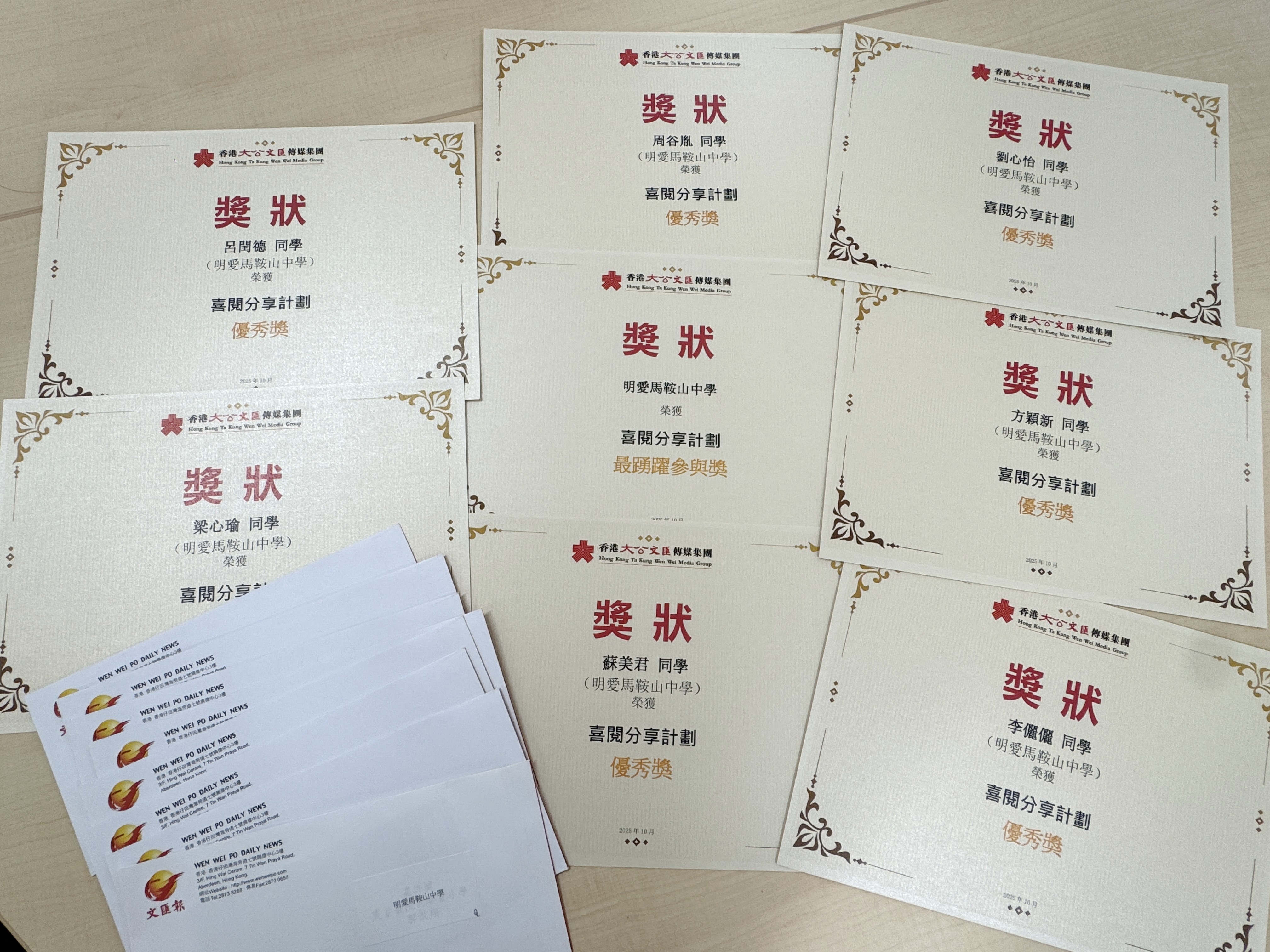 「喜閱分享」是香港大公文匯傳媒集團主辦的欄目,鼓勵學生發表個人閱讀心得。學生的作品不僅獲點新聞網站刊登,讓廣大的網友看到,香港大公文匯傳媒集團早前更在機場亞洲博覽會舉辦的「第九屆兒童書展」設置攤位,向公眾展示各位學生的優秀閱讀報告,讓公眾人士共同欣賞。明愛馬鞍山中學大力支持相關計劃,先後為多位學生的作品投稿,其中7位同學的8篇優秀作品獲選在攤位展示,學生們更獲頒個人優秀獎項,得到證書、書券、文具和文創精品作為鼓勵。校方因大力積極推動活動,更獲頒最積極參與學校獎。