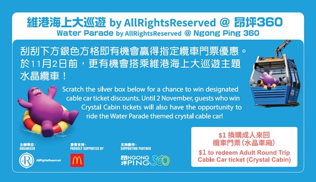 此外,由10月24日至12月12日,麥當勞親子會會員在東涌或昂坪纜車站售票處,出示有關「維港海上大巡遊」主題纜車的推廣電郵,即可獲得單程纜車車廂免費升級,以來回標準車廂纜車門票的價格,乘搭一程水晶車廂及一程標準車廂纜車。