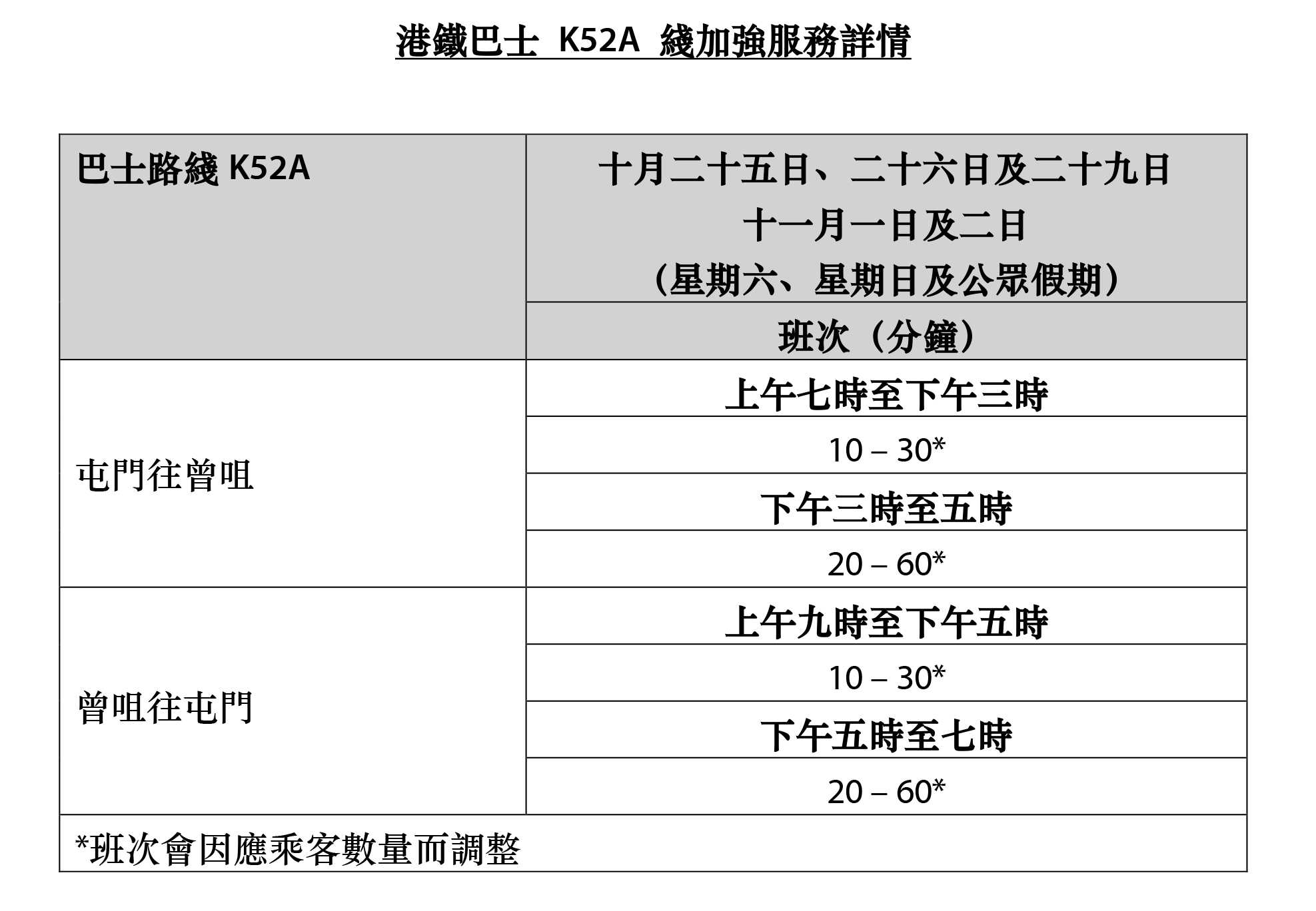 來往屯馬綫屯門站及曾咀靈灰安置所的港鐵巴士K52A綫,於10月11日至11月9日期間的周末加強服務及延長服務時間,未來兩個周末(10月25及26日、11月1及2日)及重陽節當天將進一步加密班次。
