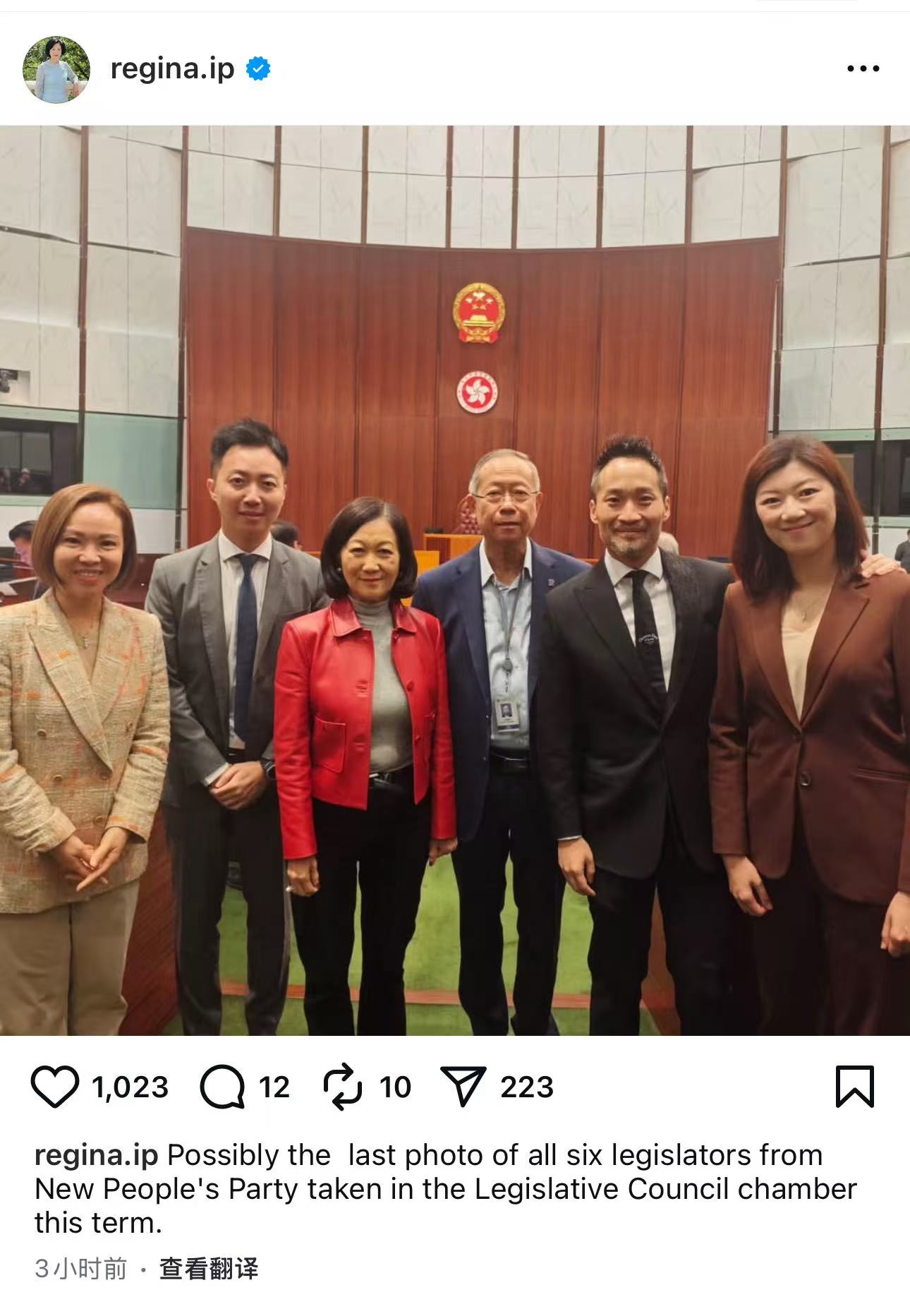 葉劉淑儀昨日(22日)出席立法會最後一次大會時,與另外5名黨友在會議廳打卡,並在社交平台發文表示「可能是今屆新民黨在議會的最後一次合照」,但仍未表明自己是否參選。她昨日中午離開會議廳時,再被追問合照是否有特別意義,她回應稱剛好齊人,又有位置,所以拍照「留為紀念」。至於是否意味6人當中有部分不能連任,她表示稱「乜嘢人連任要等嚟緊嘅選舉決定」。