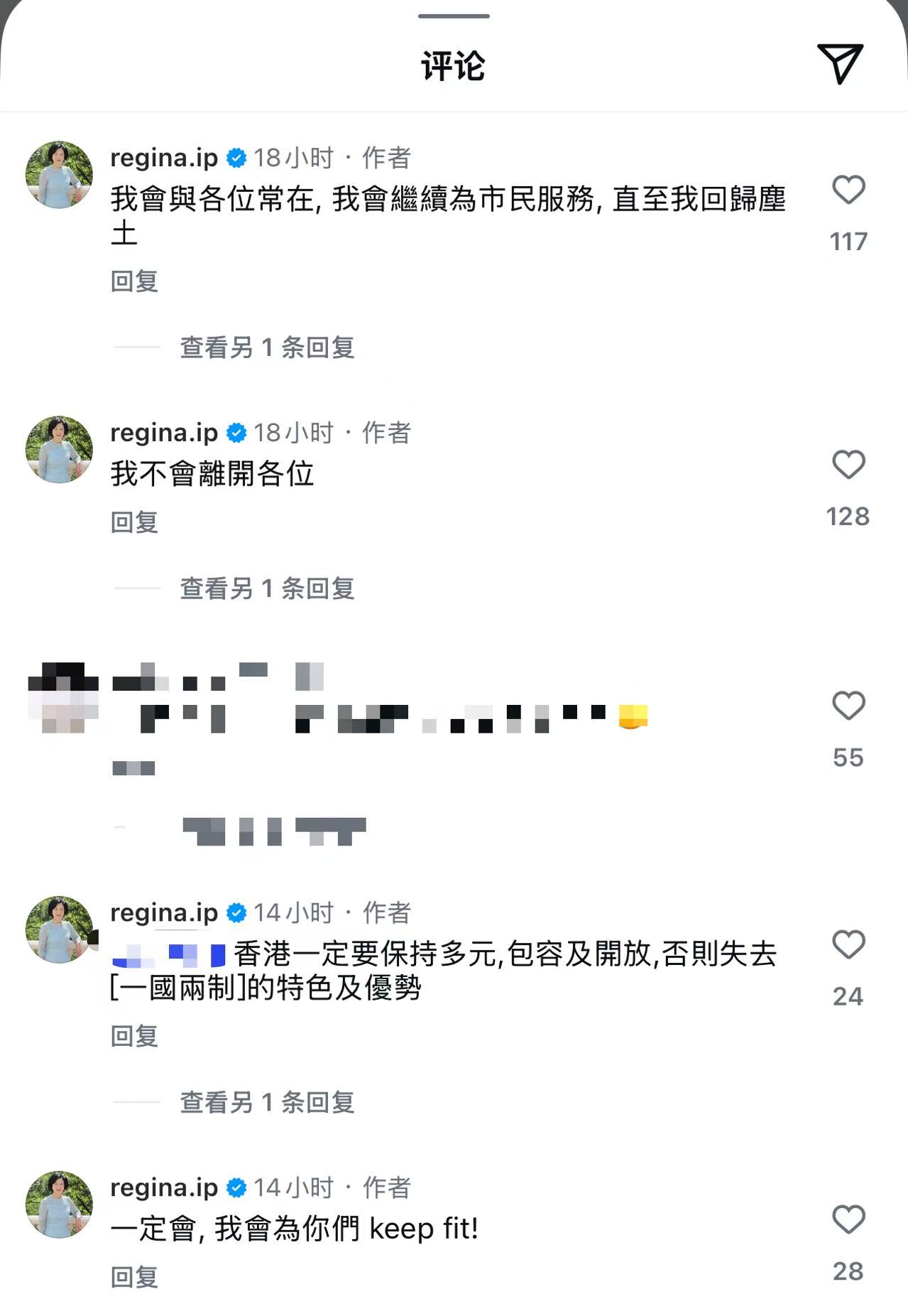 葉劉淑儀亦在該條帖文留言區與網友積極互動,多次留言回應支持者。有網友請她「保重」,她答稱「一定會,我會為你們keep fit!」。有網友表達「不捨」,查問她是否會繼續更新ig,她回應稱「我不會離開各位」,「我會與各位常在」。